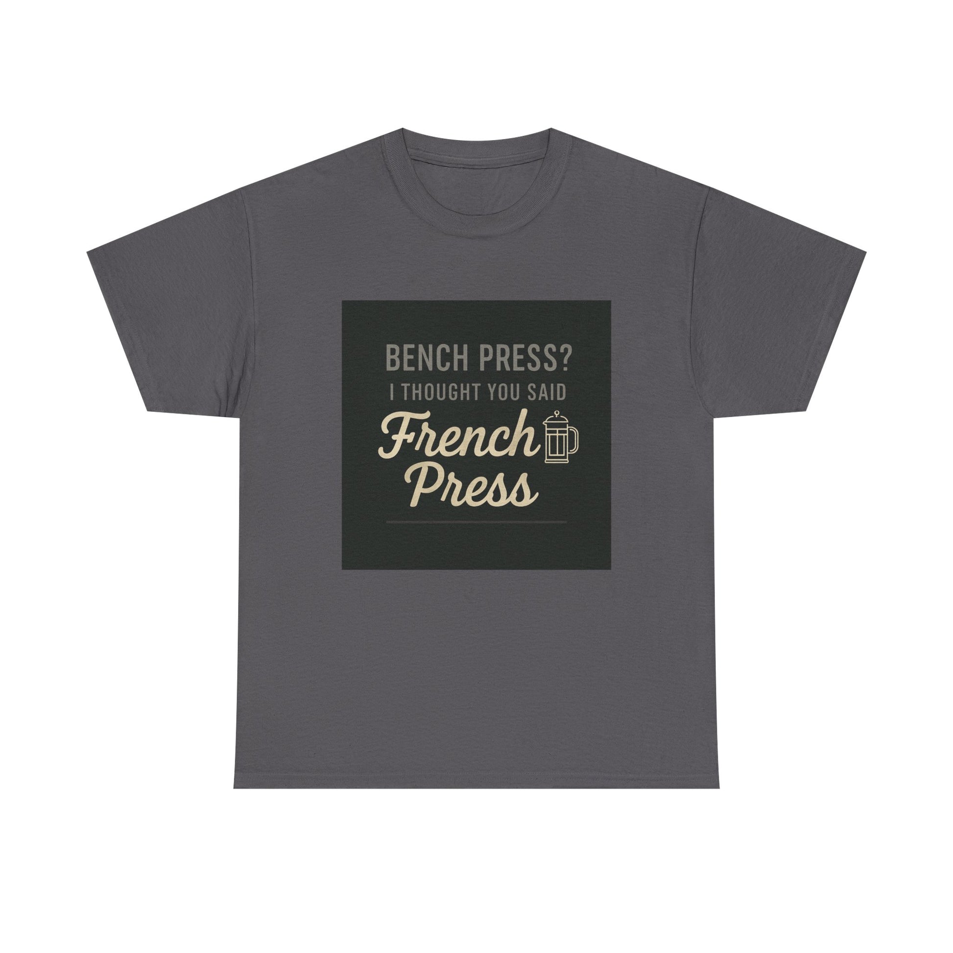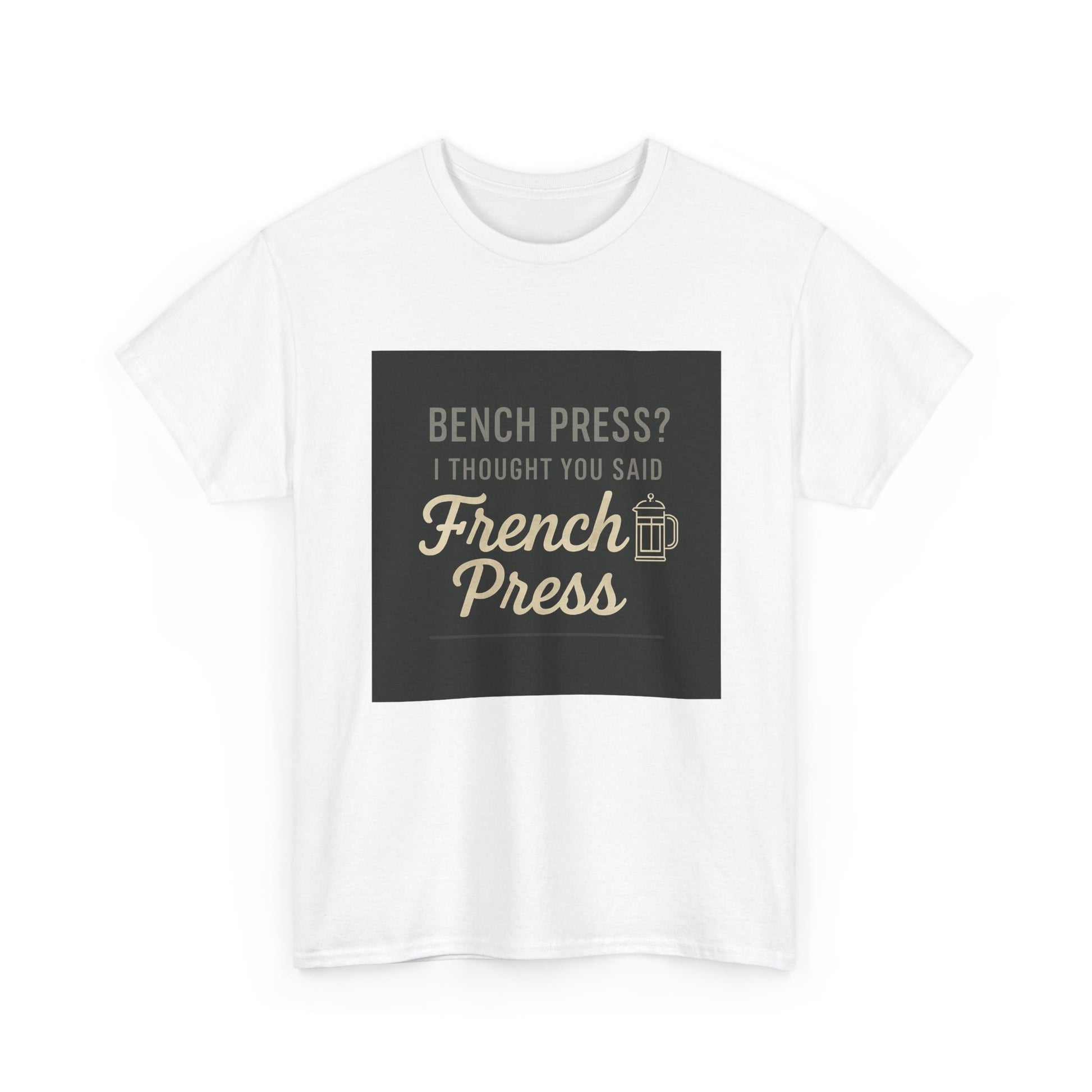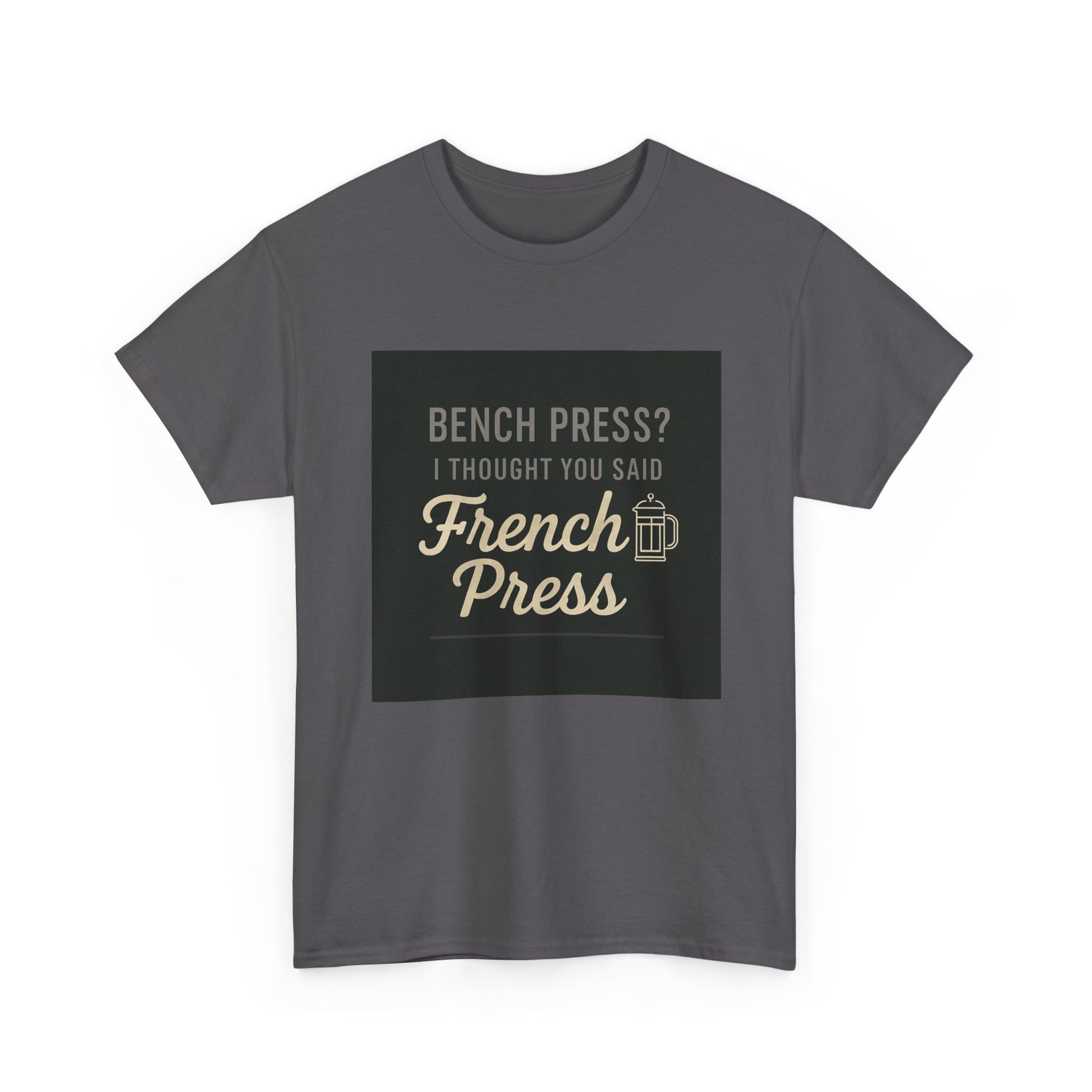 Coffee Humor Tee — “Bench Press? I Thought You Said French Press”