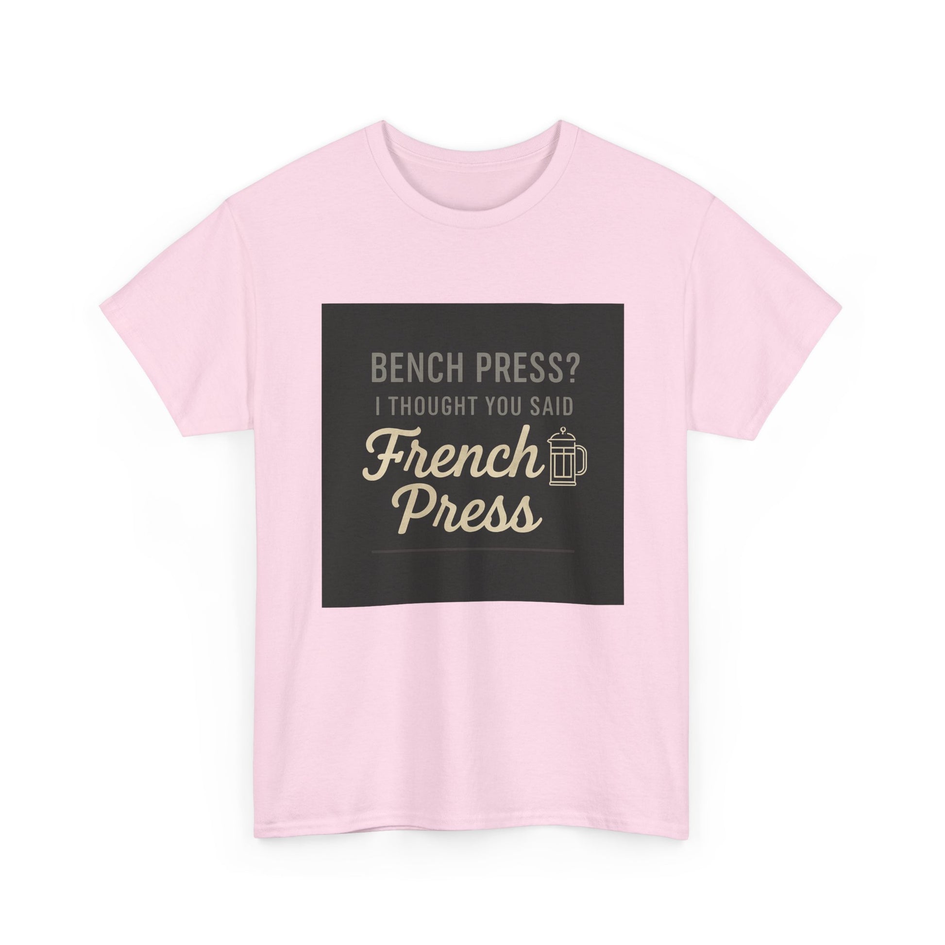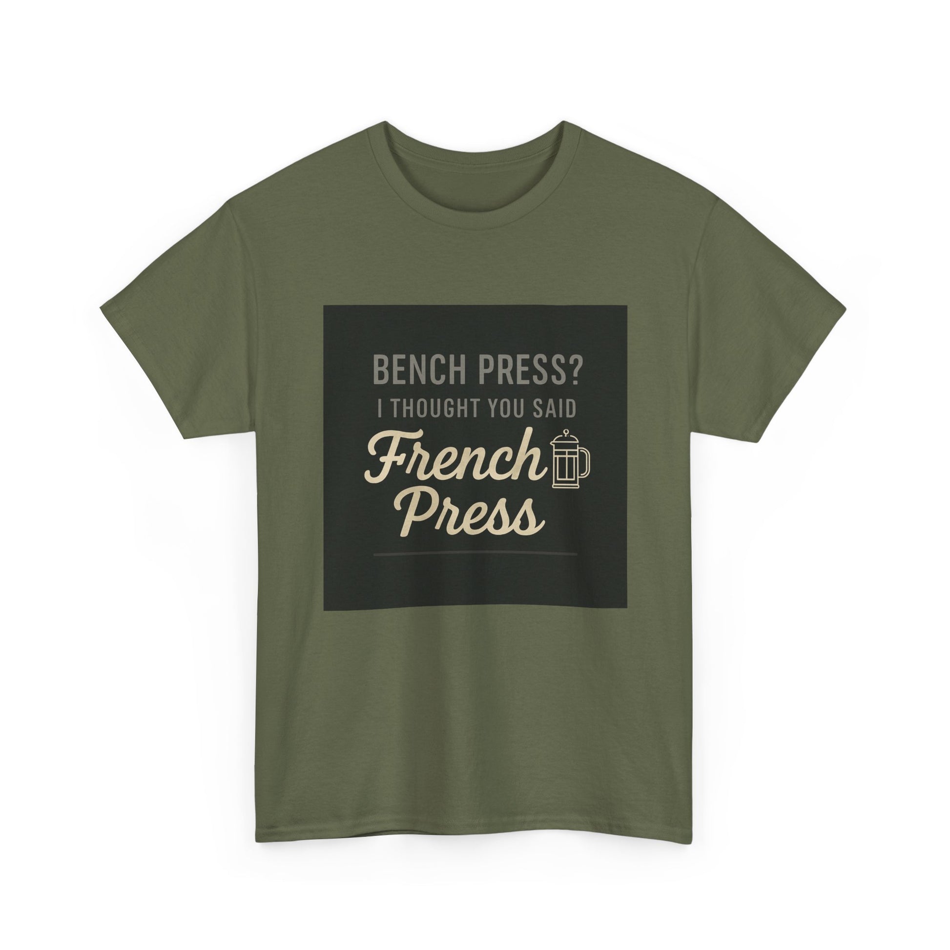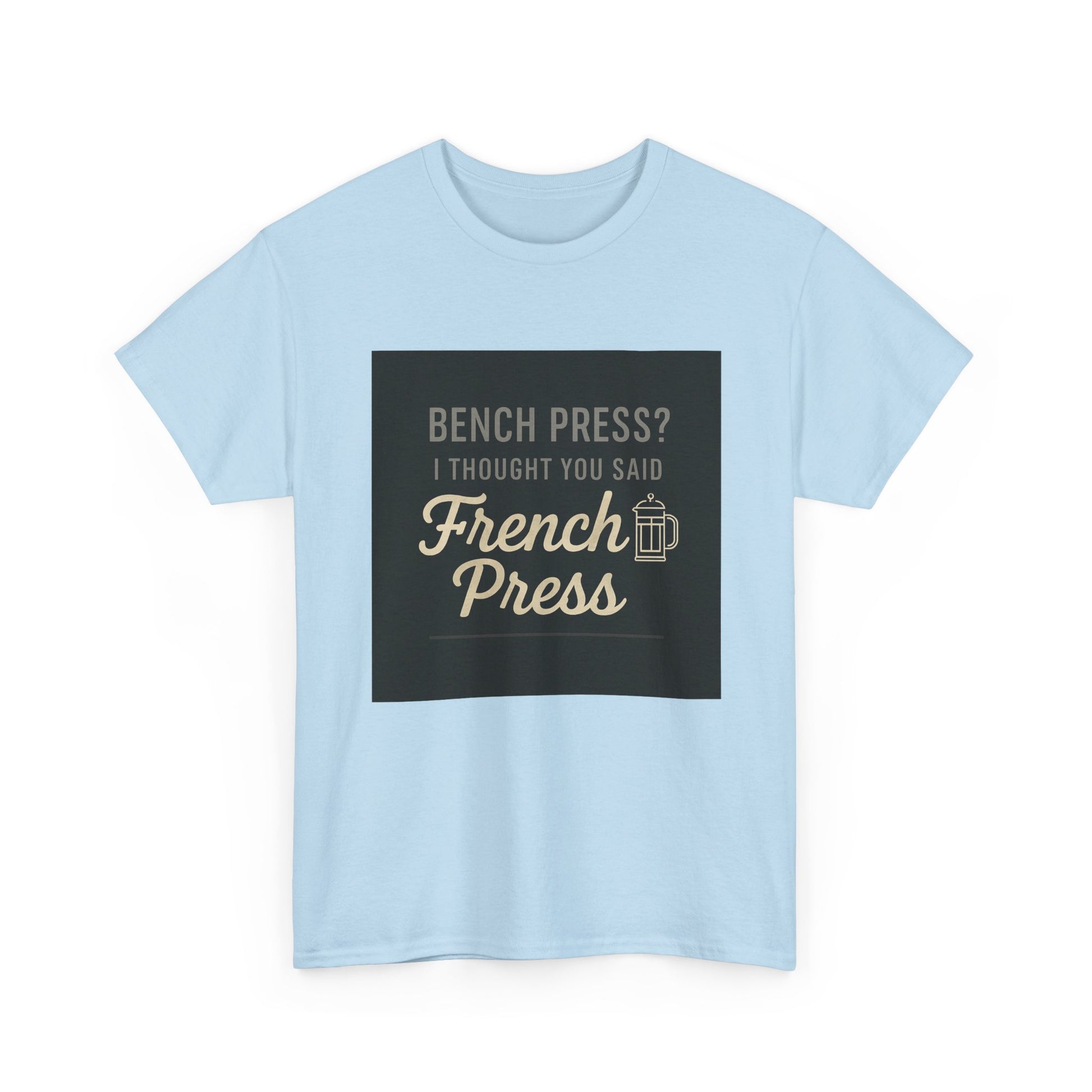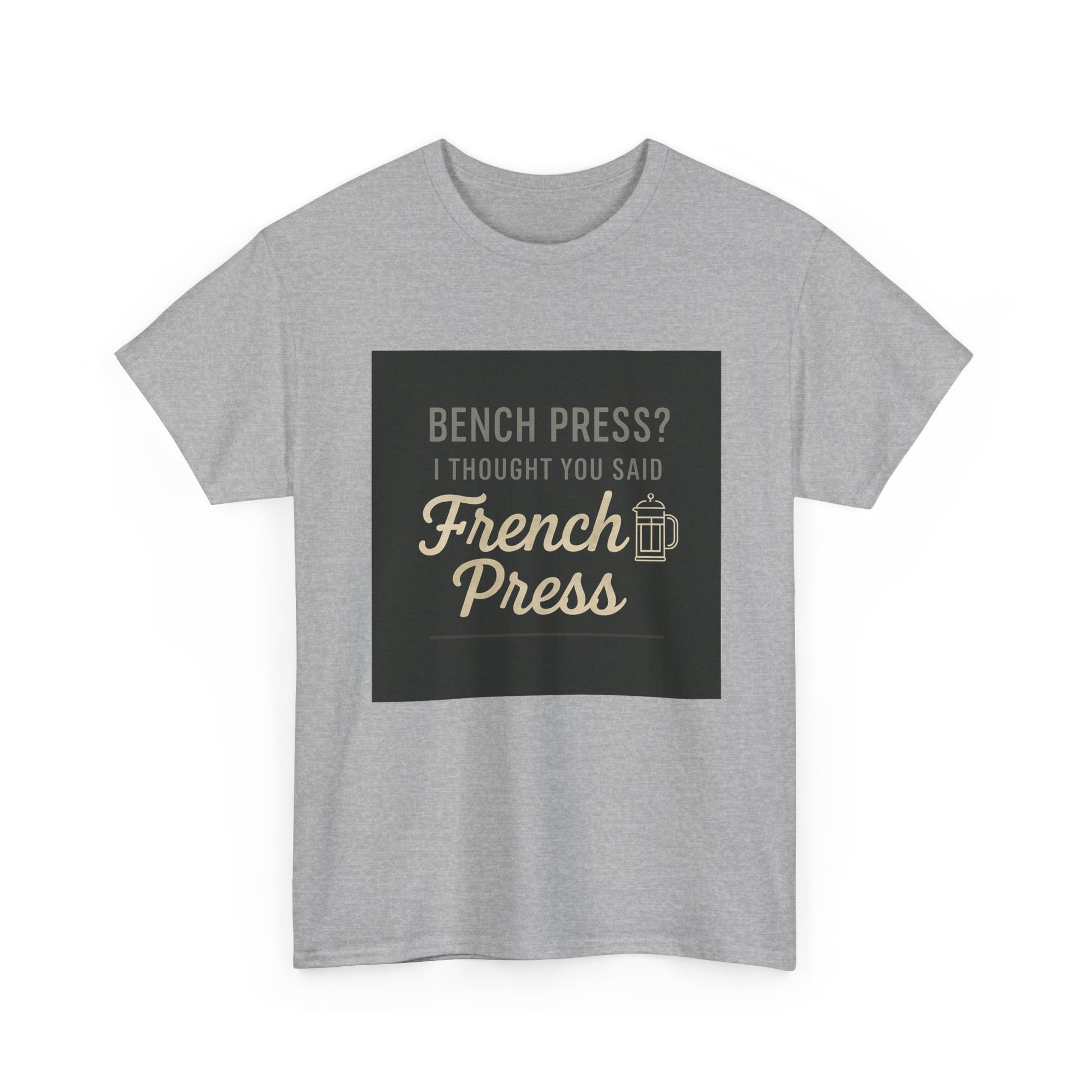 Coffee Humor Tee — “Bench Press? I Thought You Said French Press”