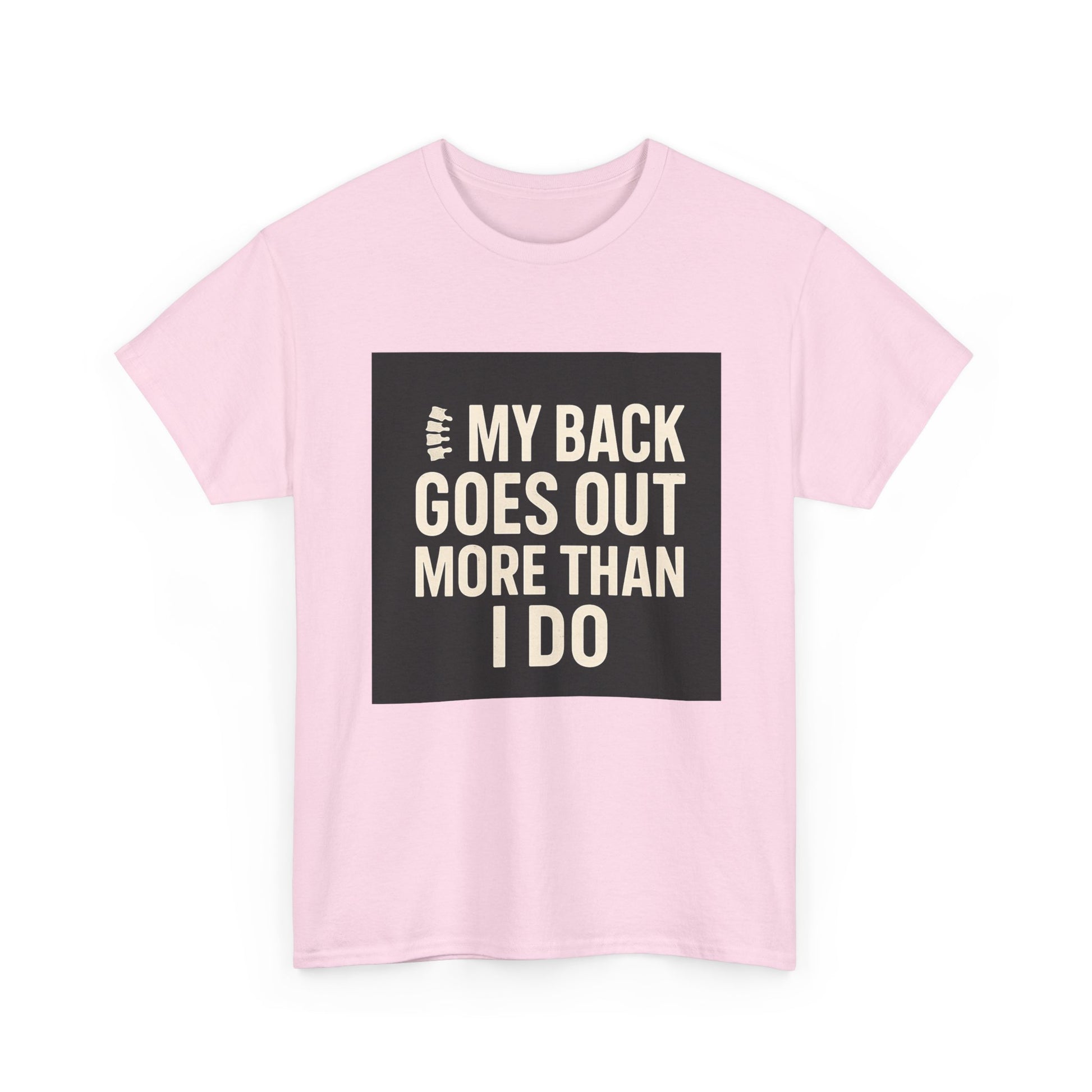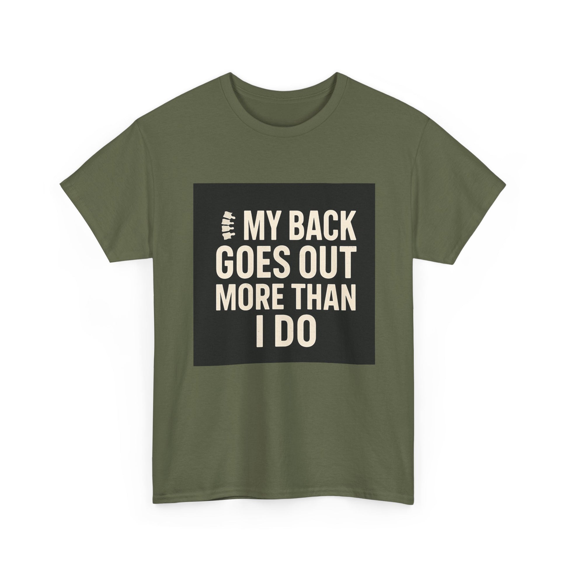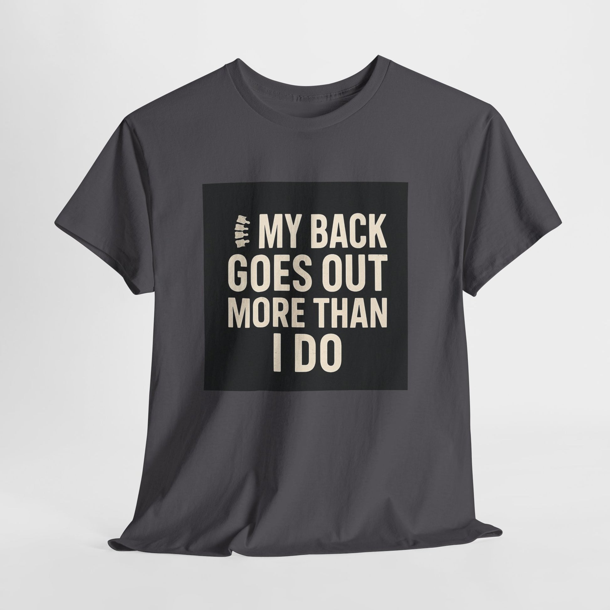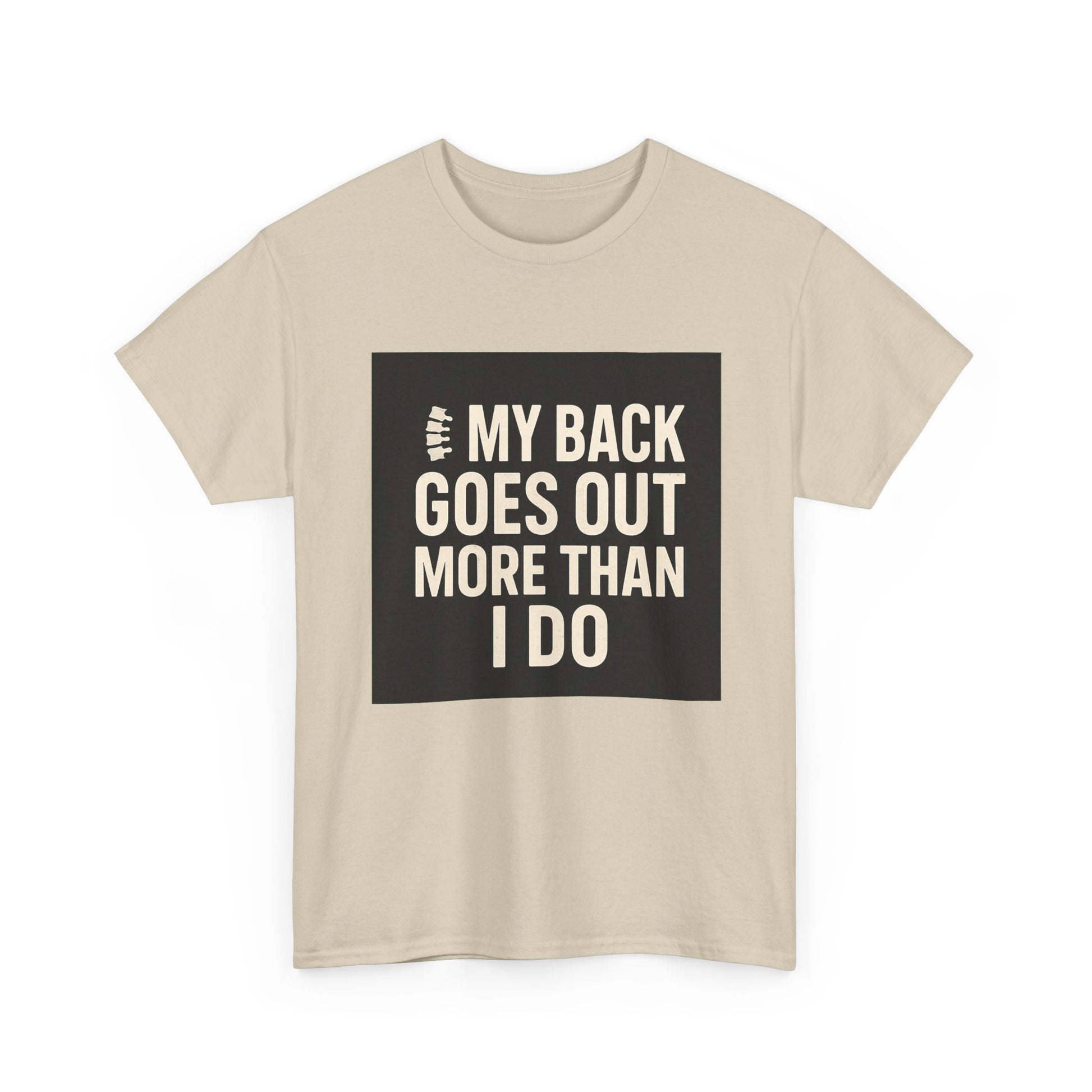 Funny Pain Relief Tee — "My Back Goes Out More Than I Do" Graphic T-Shirt