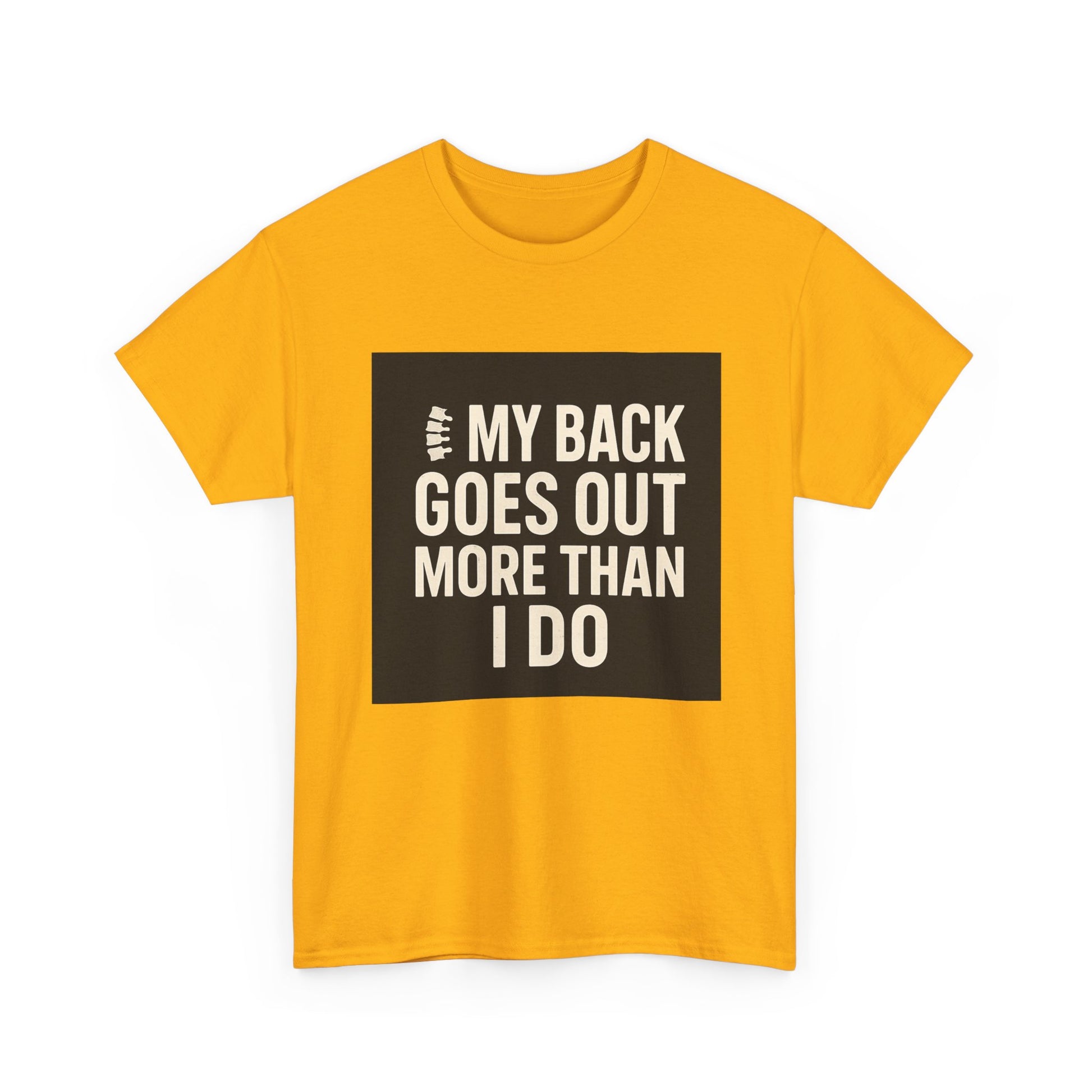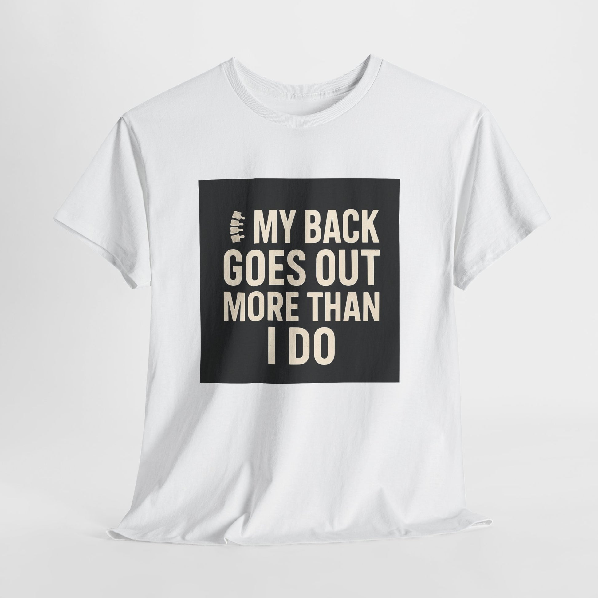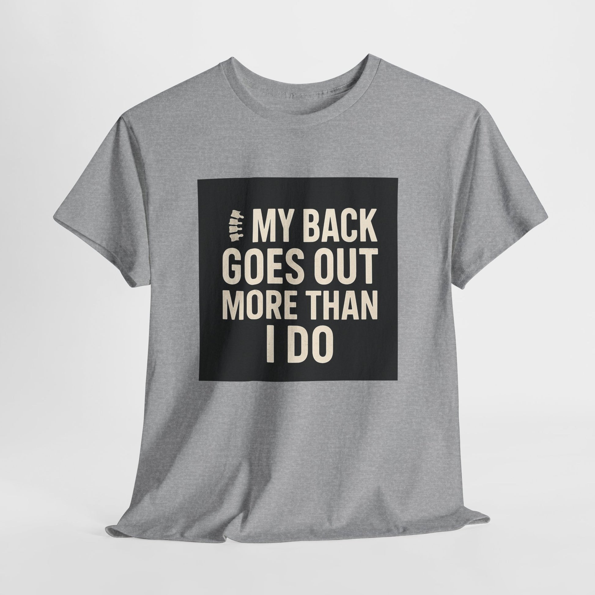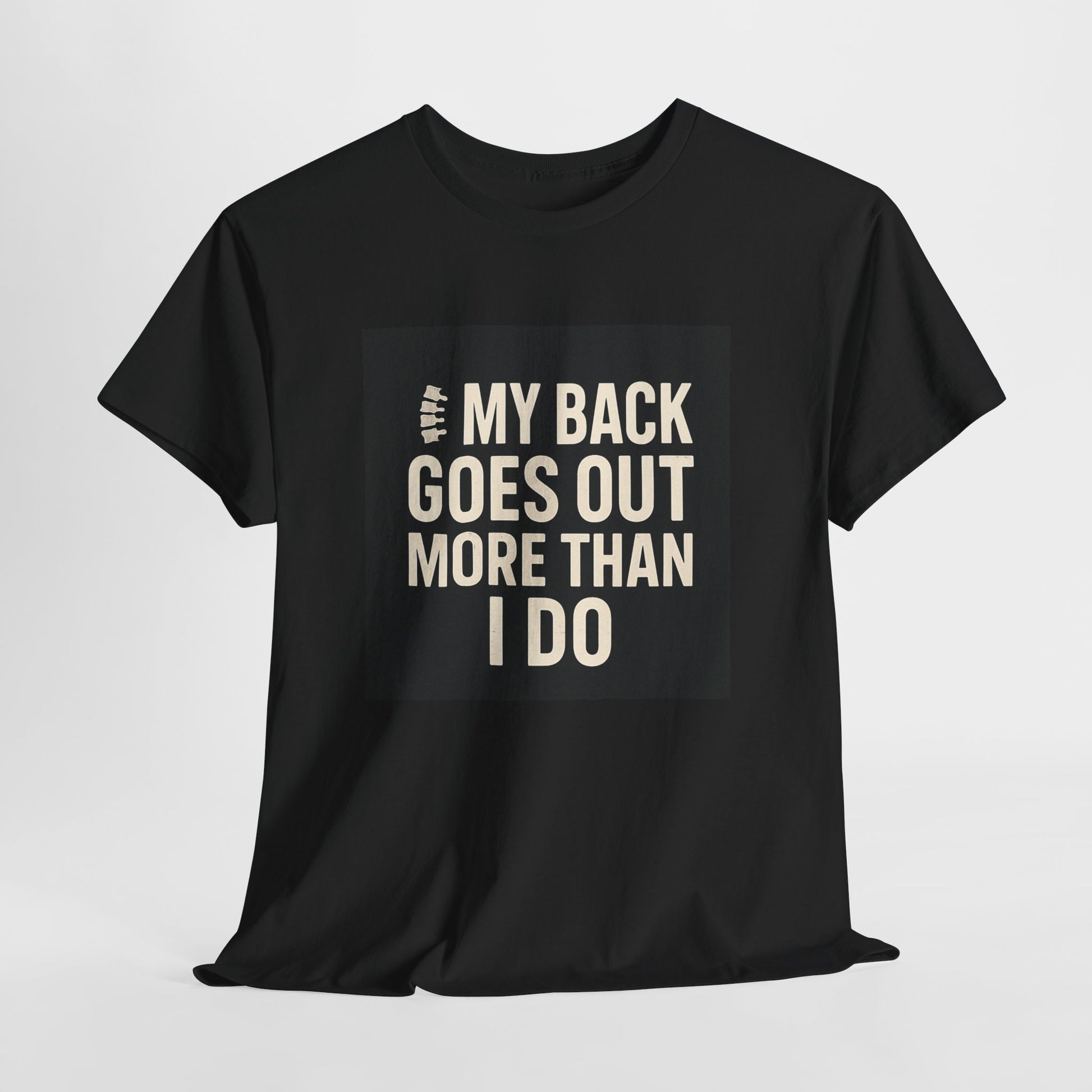 Funny Pain Relief Tee — "My Back Goes Out More Than I Do" Graphic T-Shirt
