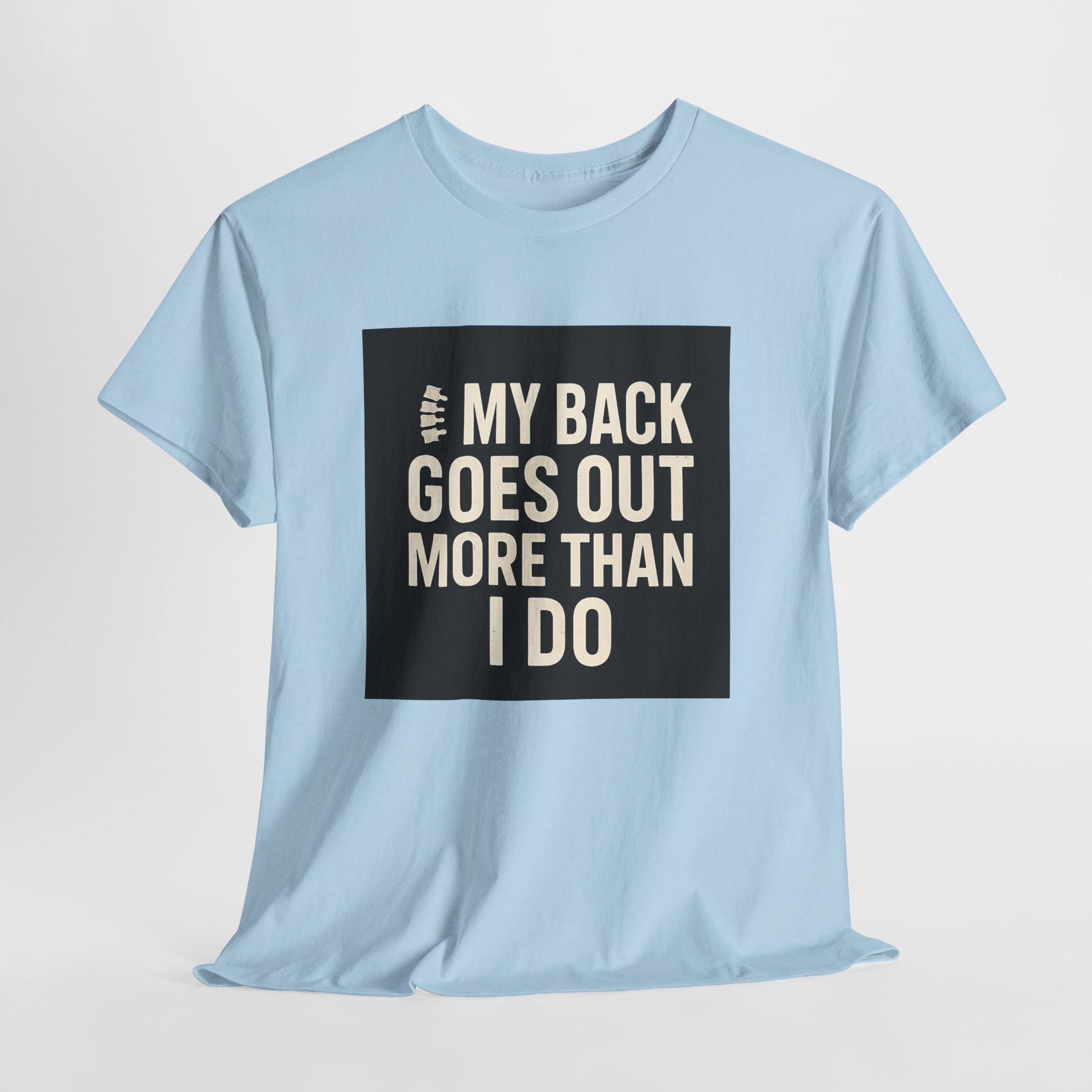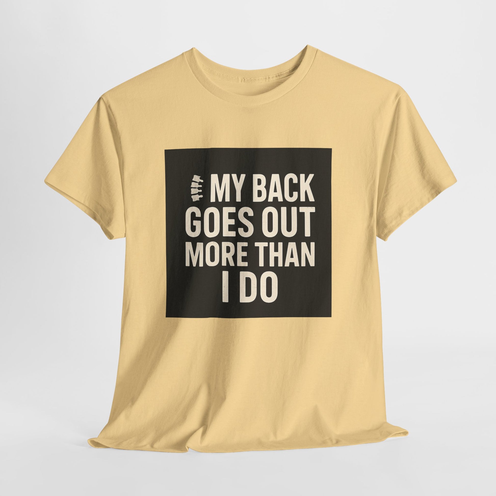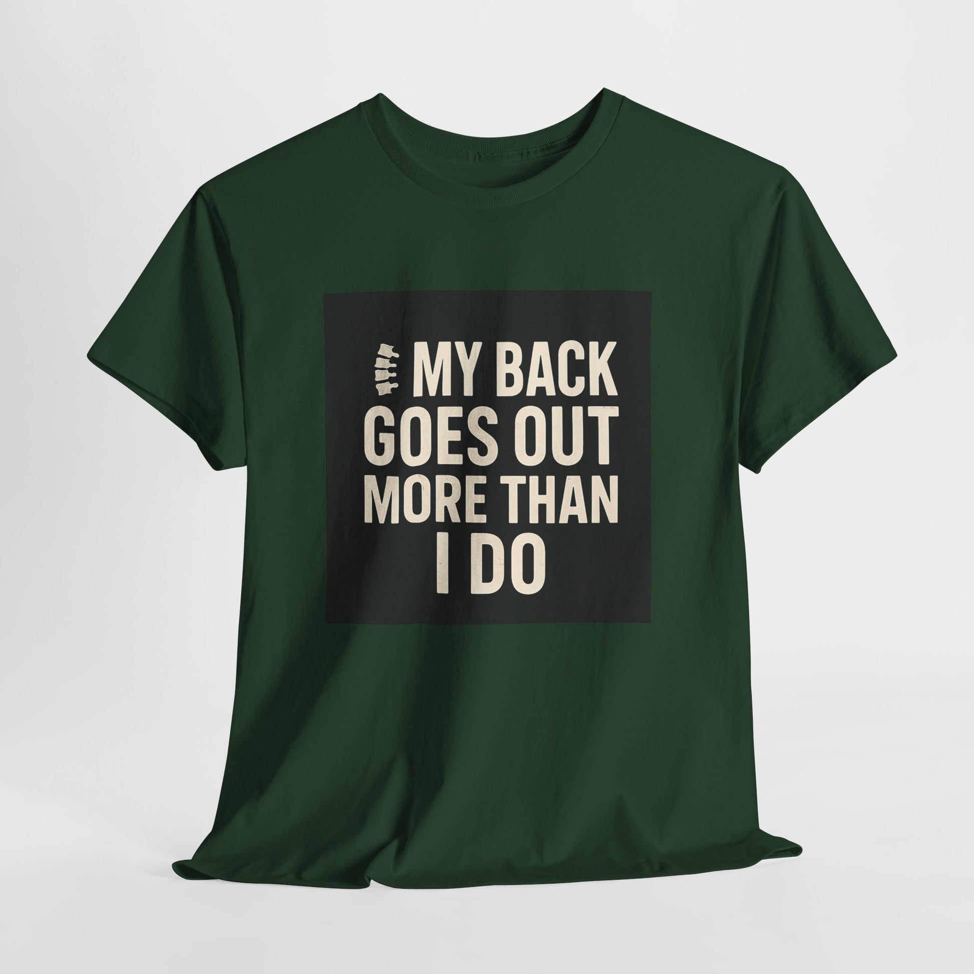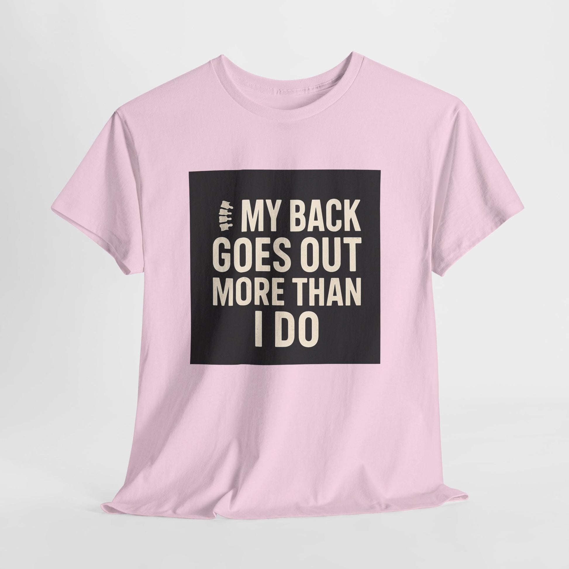 Funny Pain Relief Tee — "My Back Goes Out More Than I Do" Graphic T-Shirt
