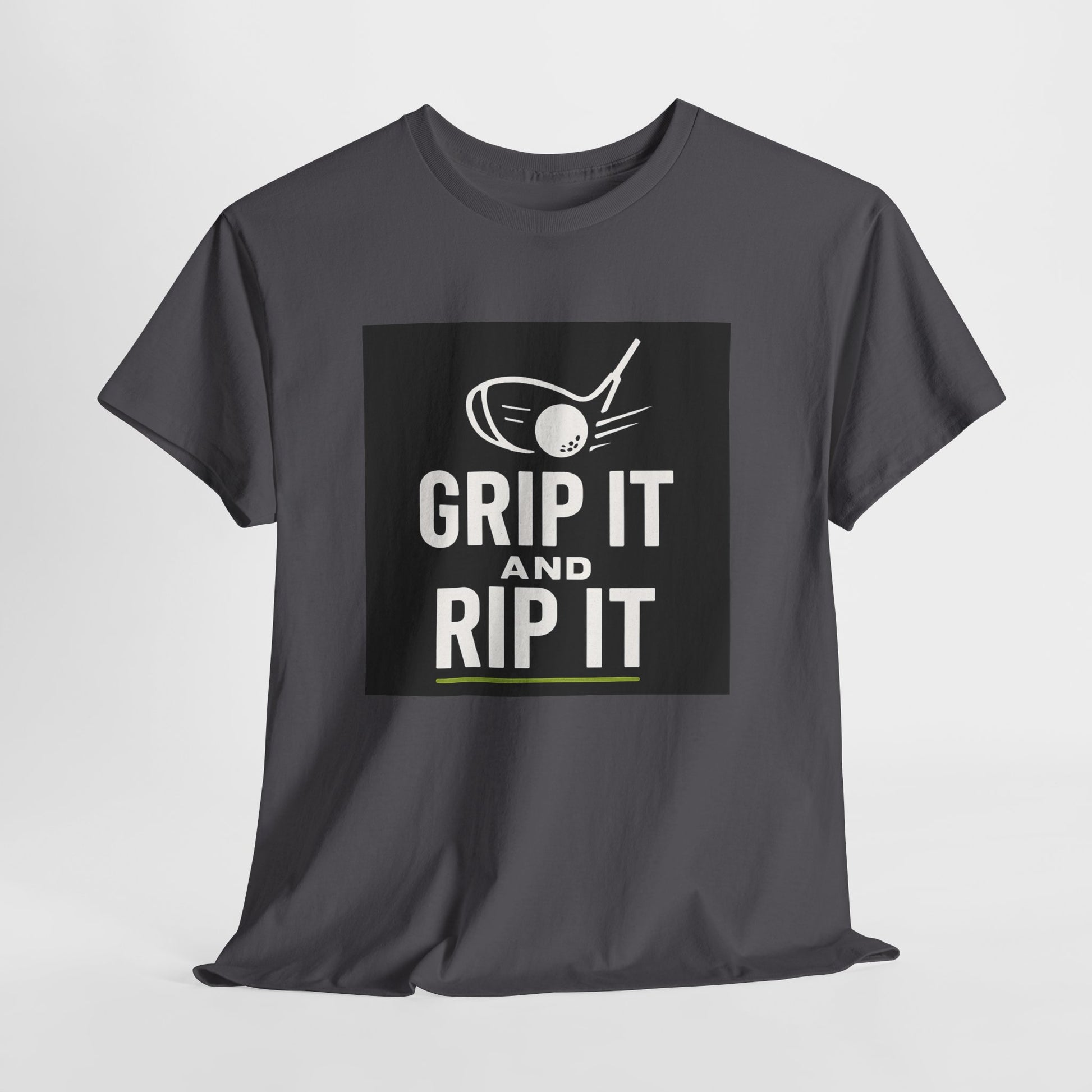 This relaxed crew-neck tee carries a bold, athletic vibe—square-front graphic with a stylized golf club and ball and the confident phrase “GRIP IT AND RIP IT.” It sits clean on a white canvas so the high-contrast print pops, whether worn on the course, at the range, or while hanging out with friends after a round. The shirt feels sturdy yet breathable thanks to midweight cotton and a classic fit that drapes casually without clinging. Small details like a ribbed collar, tear-away label, and reinforced shoulder tape keep it comfortable and long-lasting. Wear it when you want to signal playful confidence and a love of swinging hard.