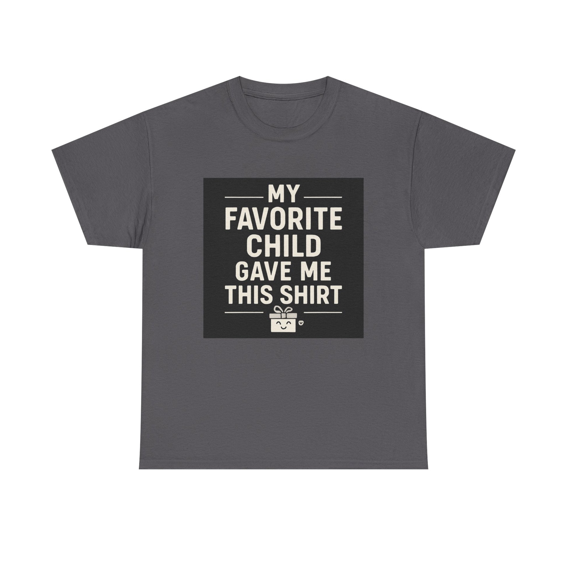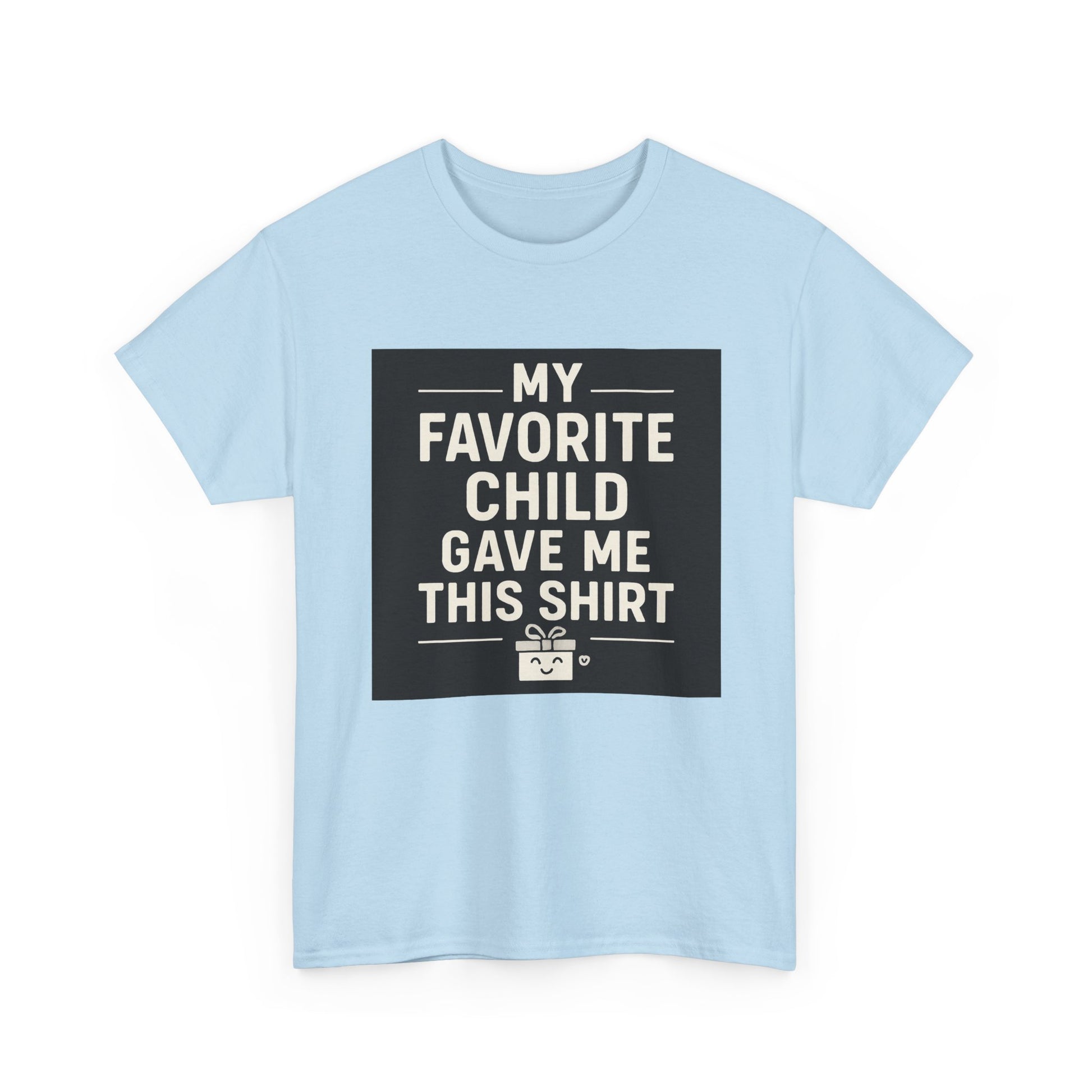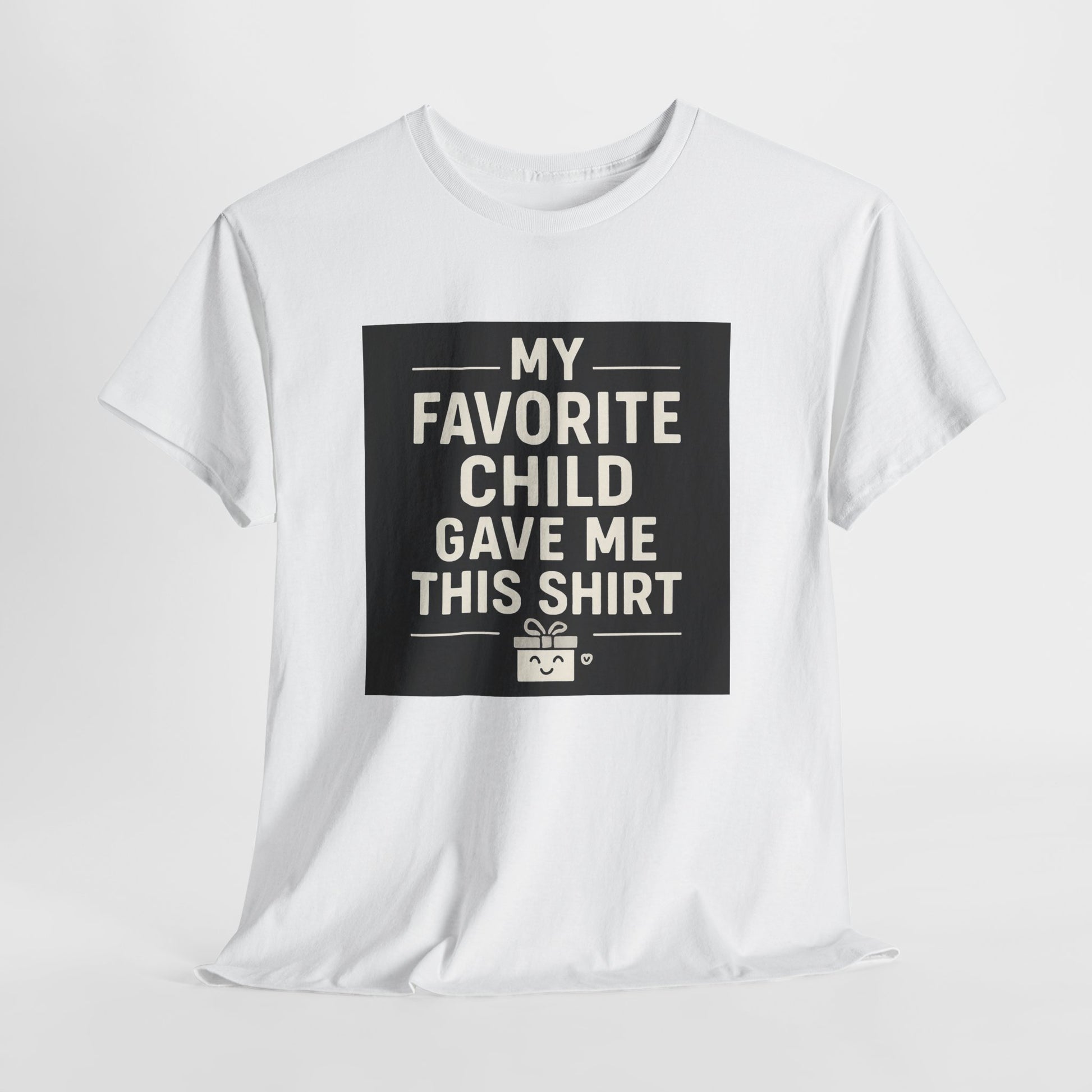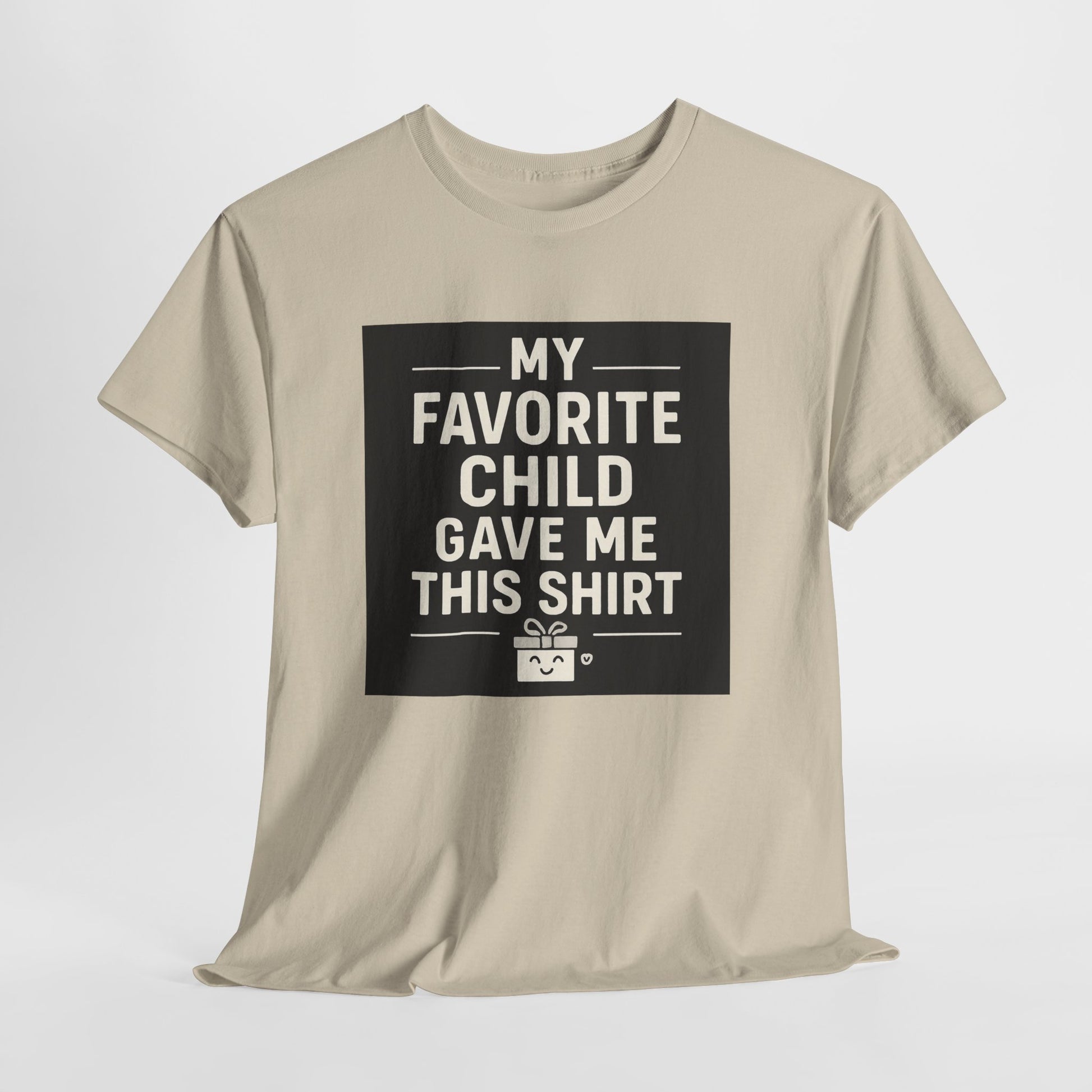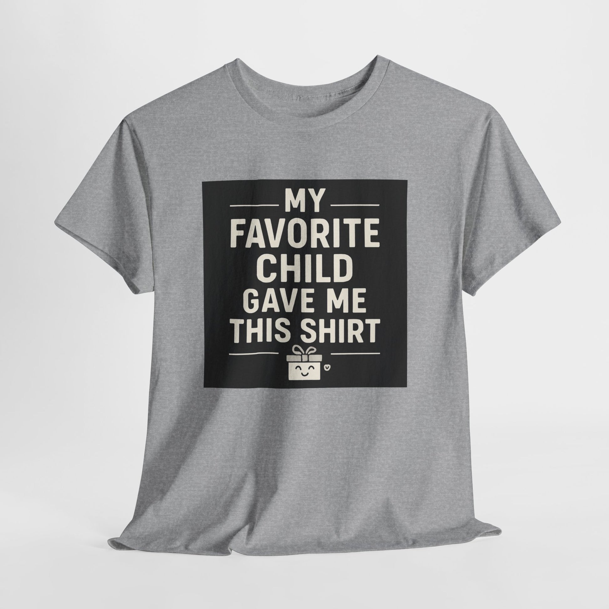 A soft, everyday tee that says what everyone’s thinking with a wink. The shirt features a bold, square-front print reading “MY FAVORITE CHILD GAVE ME THIS SHIRT” with a small gift icon beneath. It’s casual and comfortable, cut in a classic crew-neck silhouette that sits relaxed on the shoulders. The fabric has a smooth surface for crisp printing and a slightly textured Natural option with tiny flecks for a lived-in look. Wear it to family dinners, casual outings, or low-key celebrations where a little humor softens the mood and starts conversations.