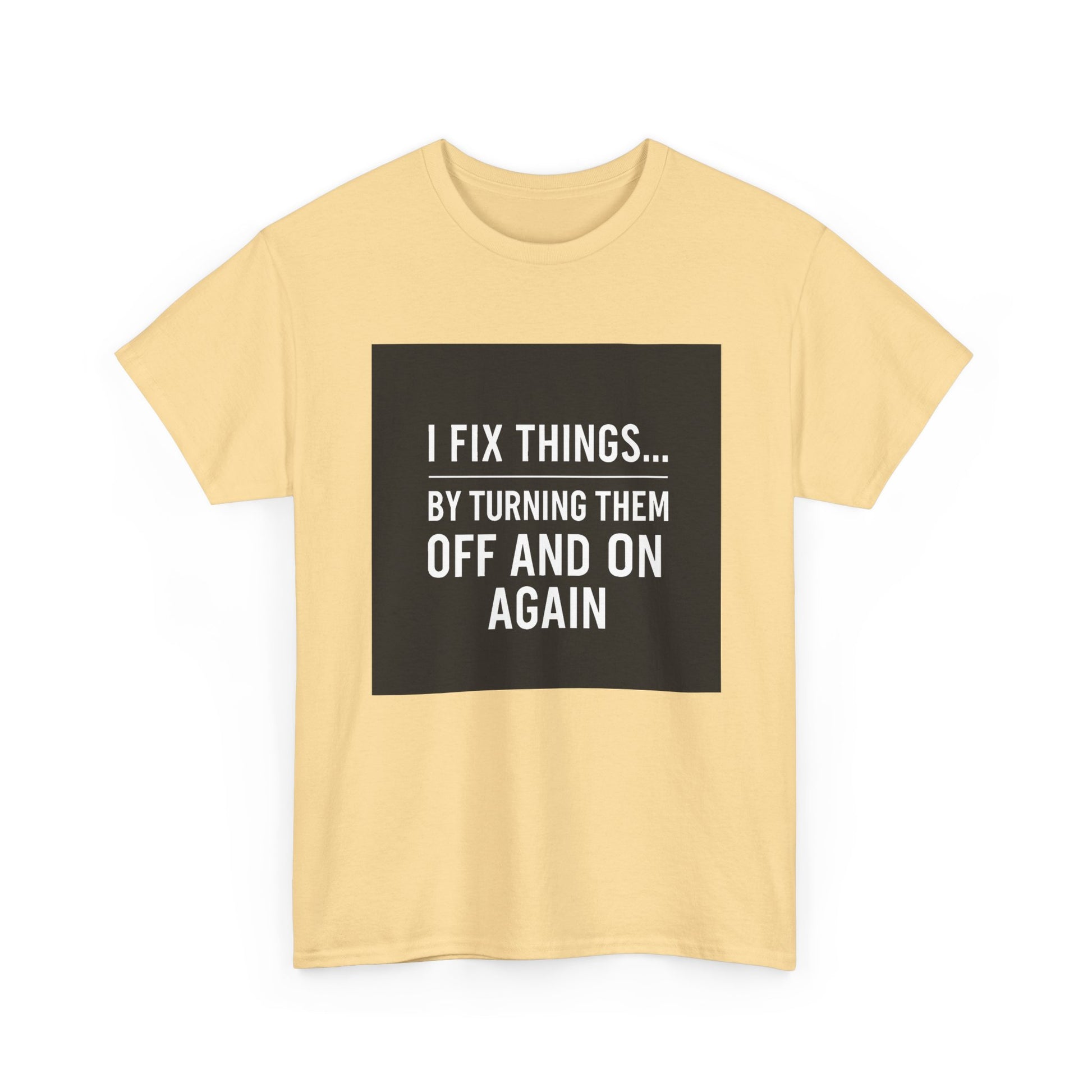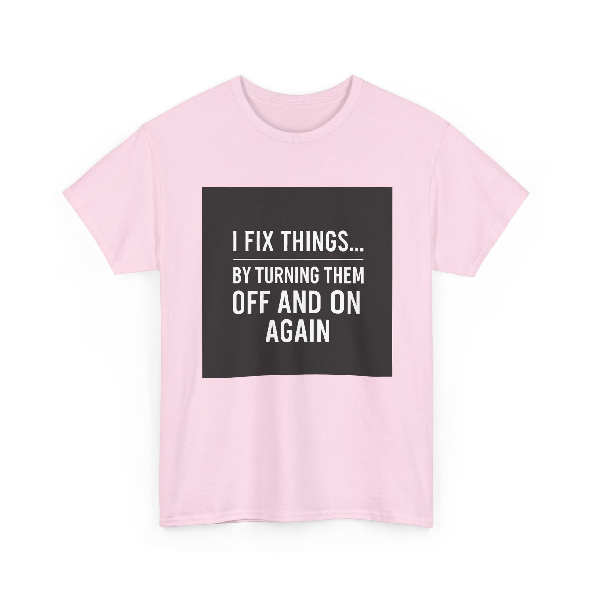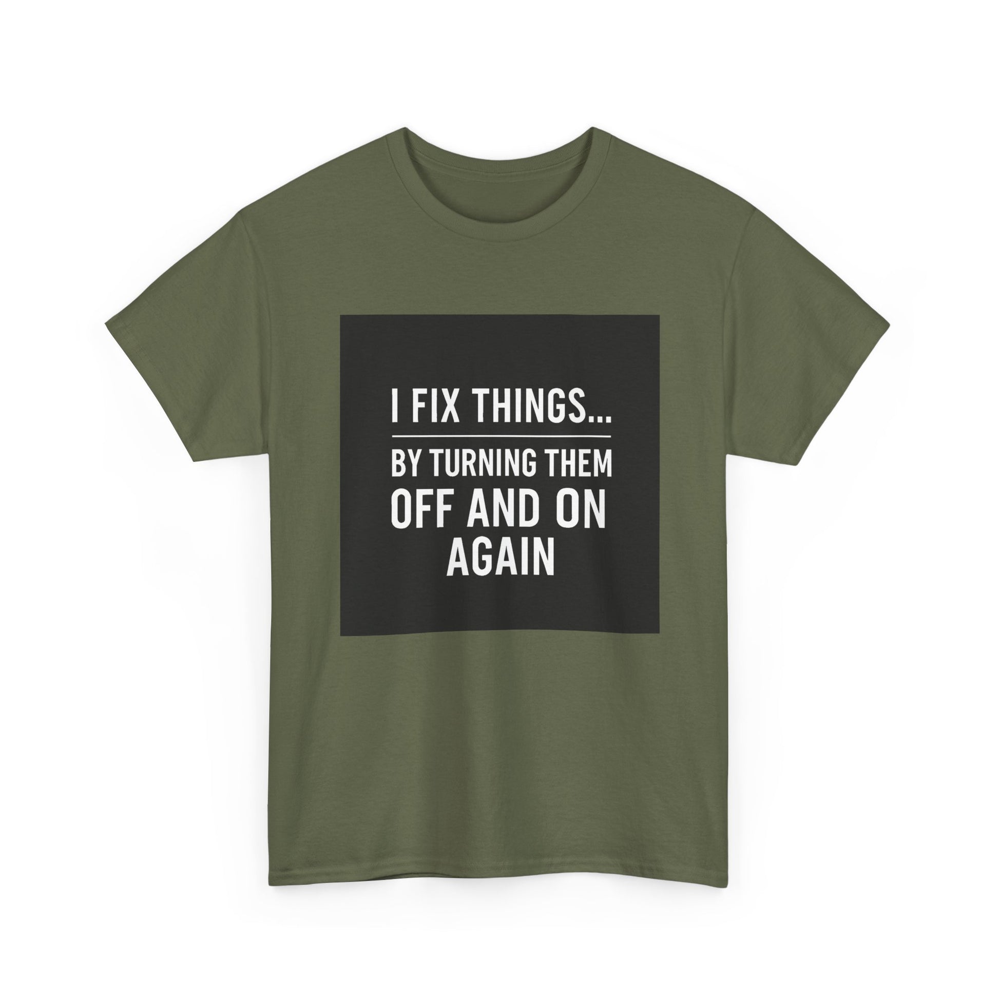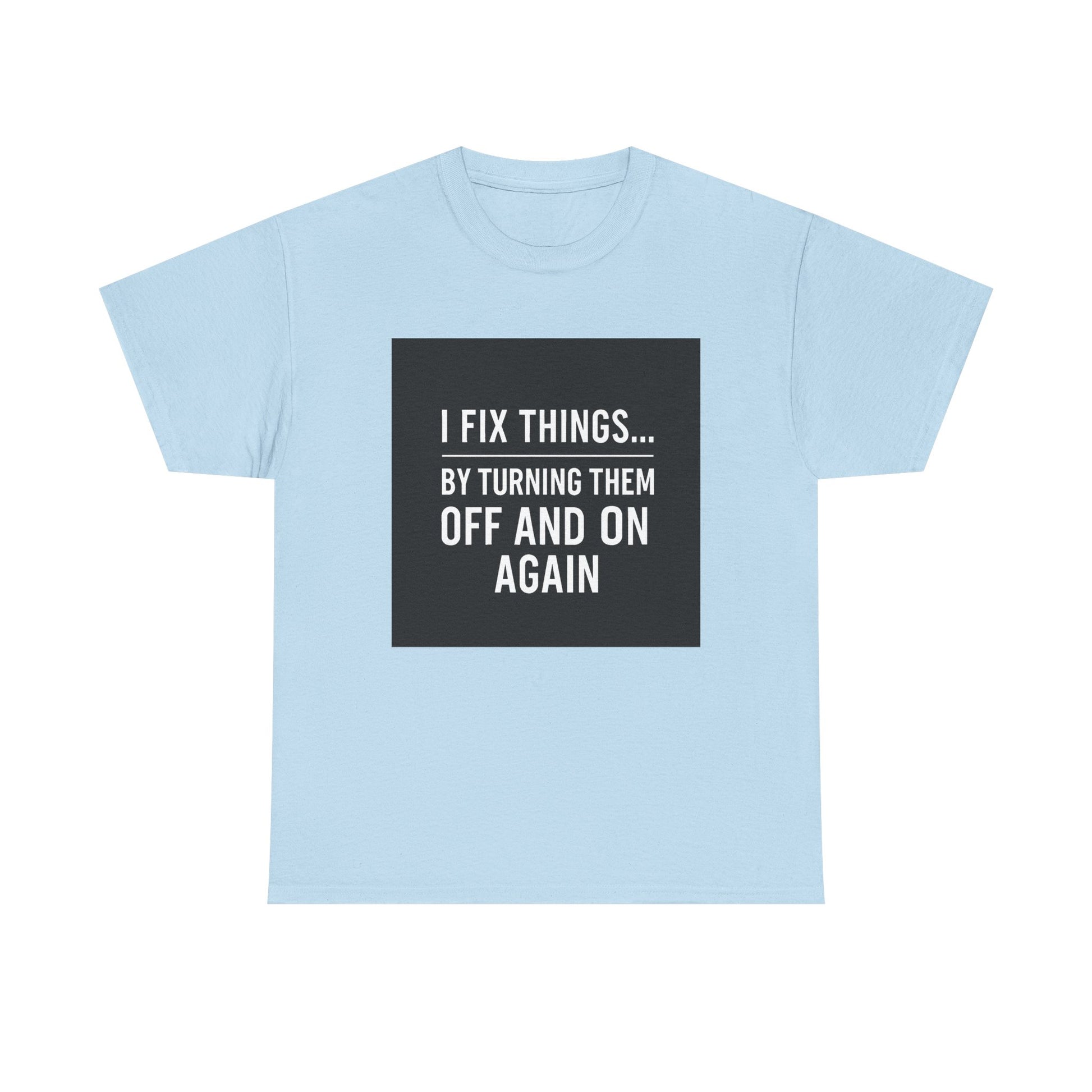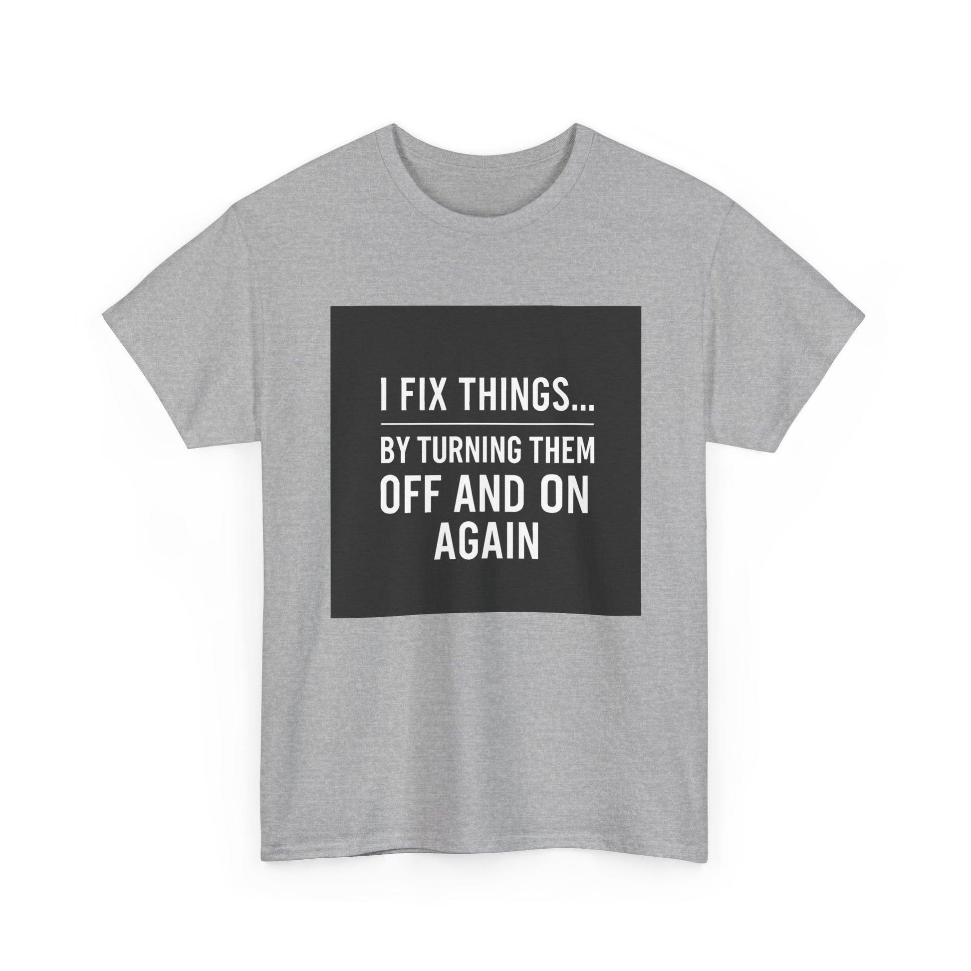 Tech Support Joke T-Shirt — "I Fix Things by Turning Them Off and On Again"