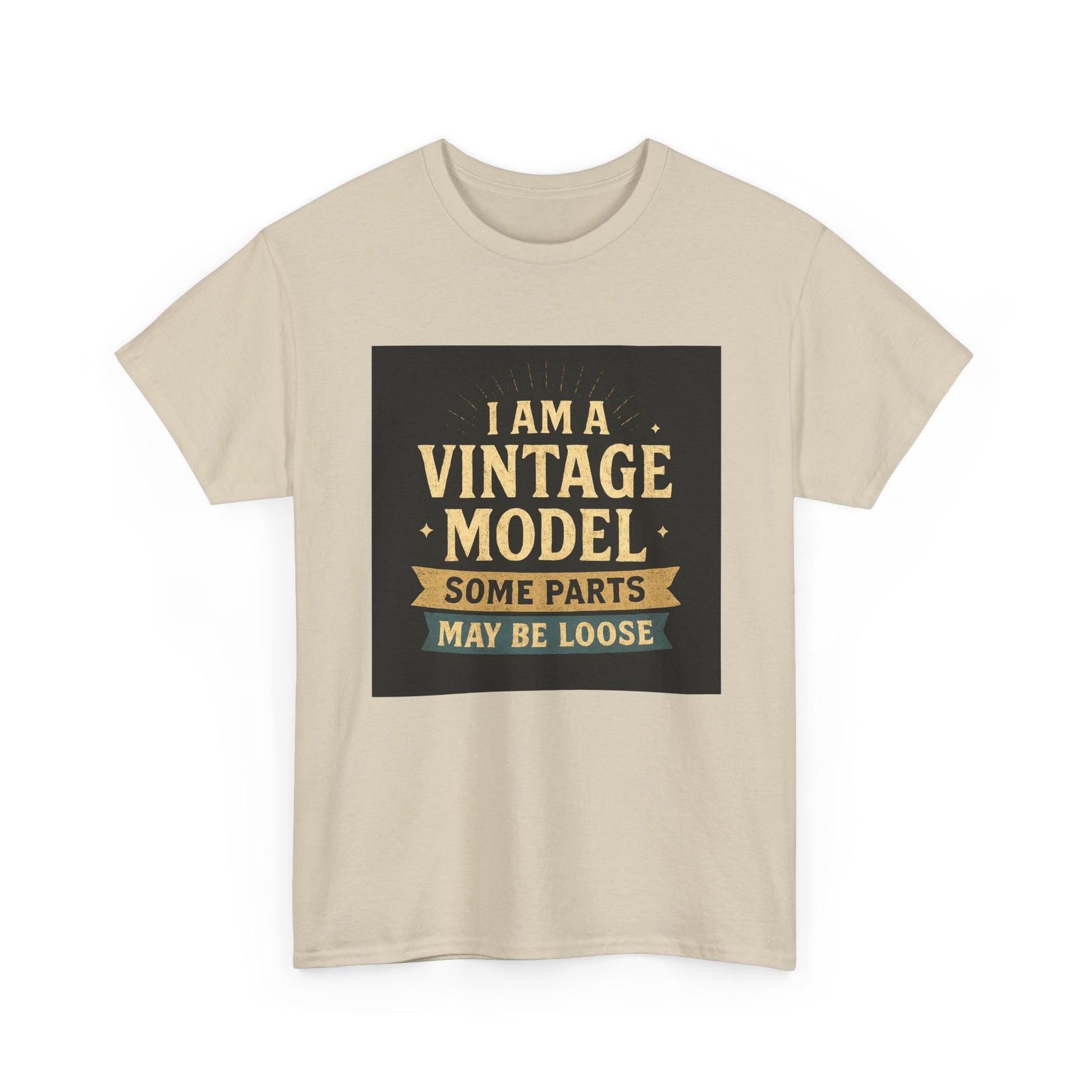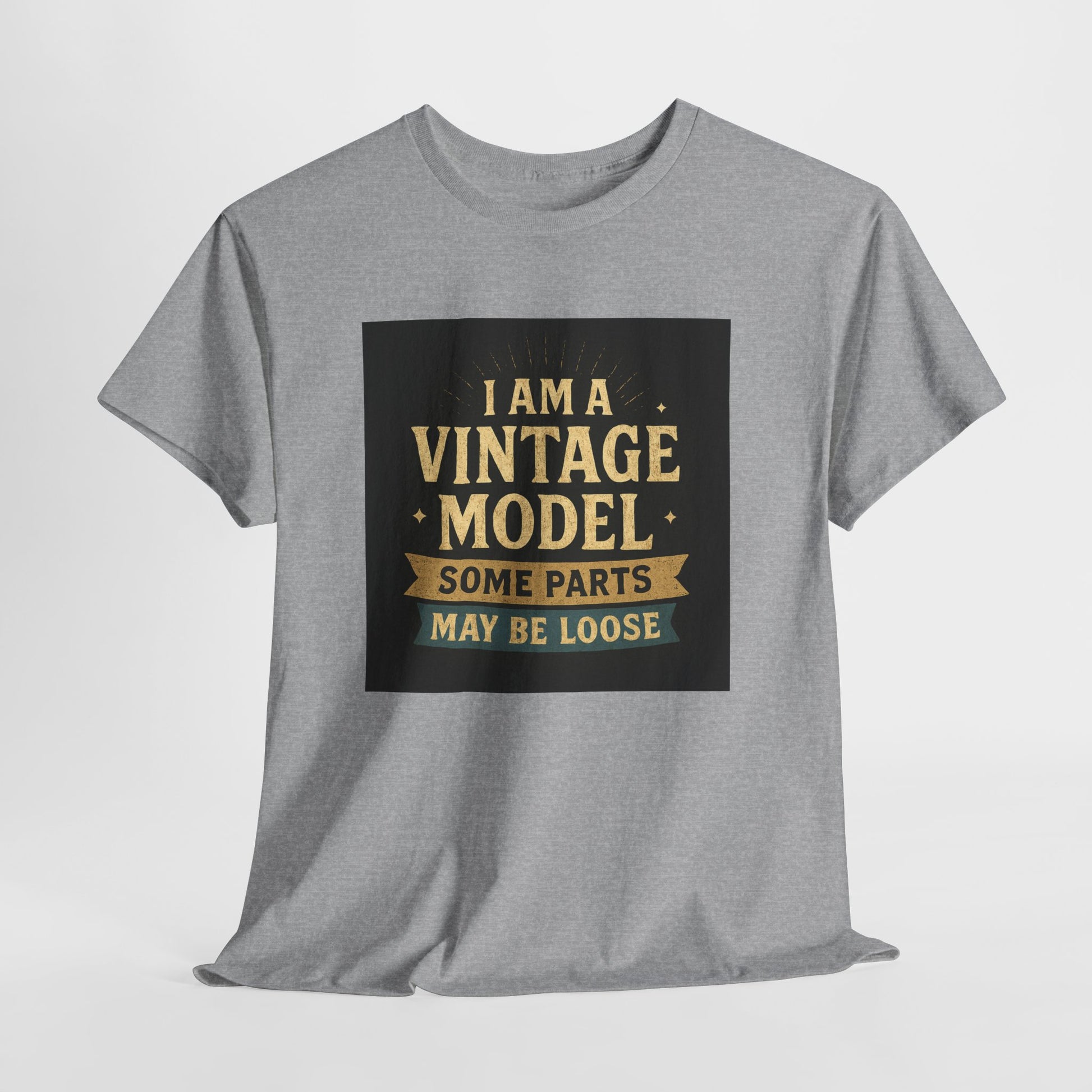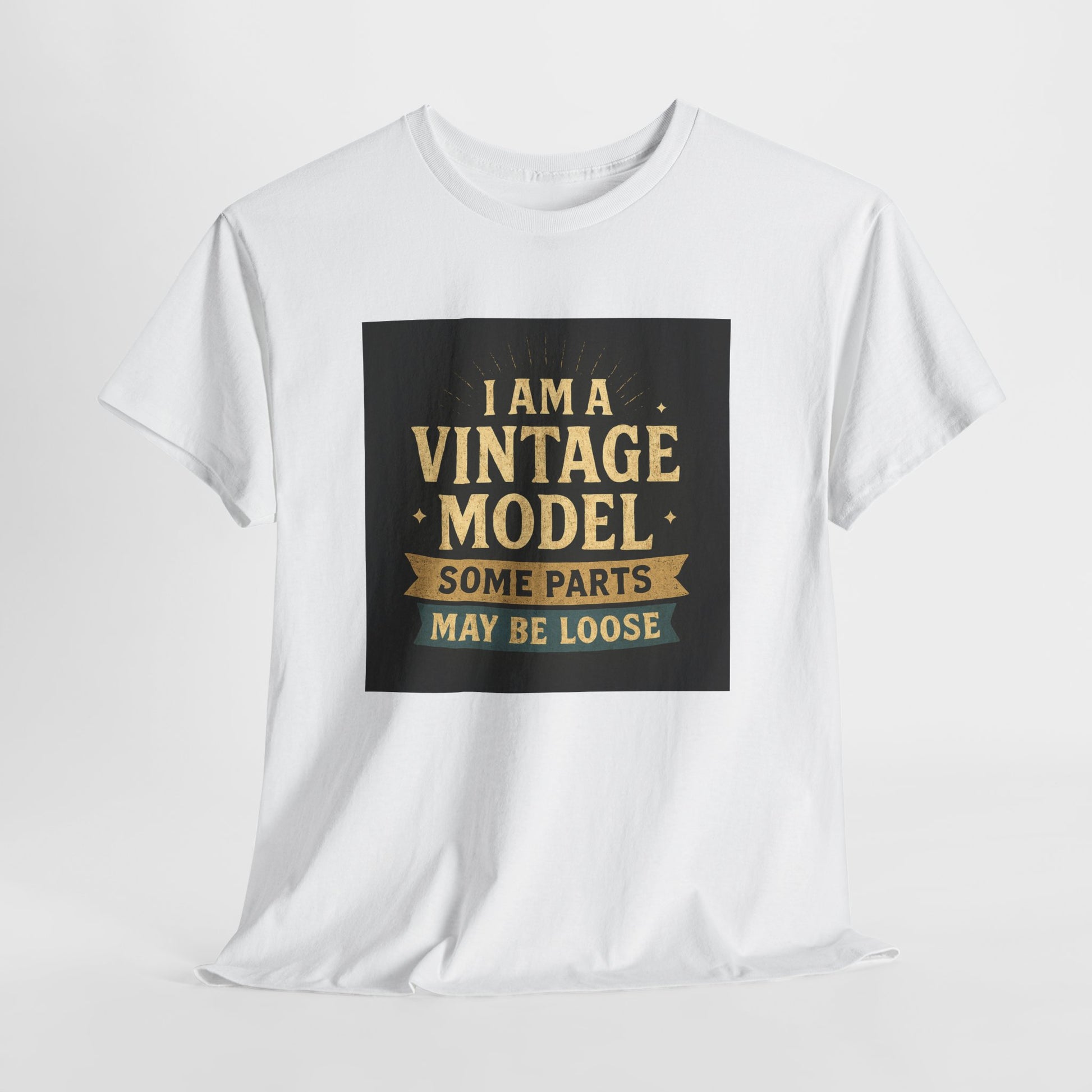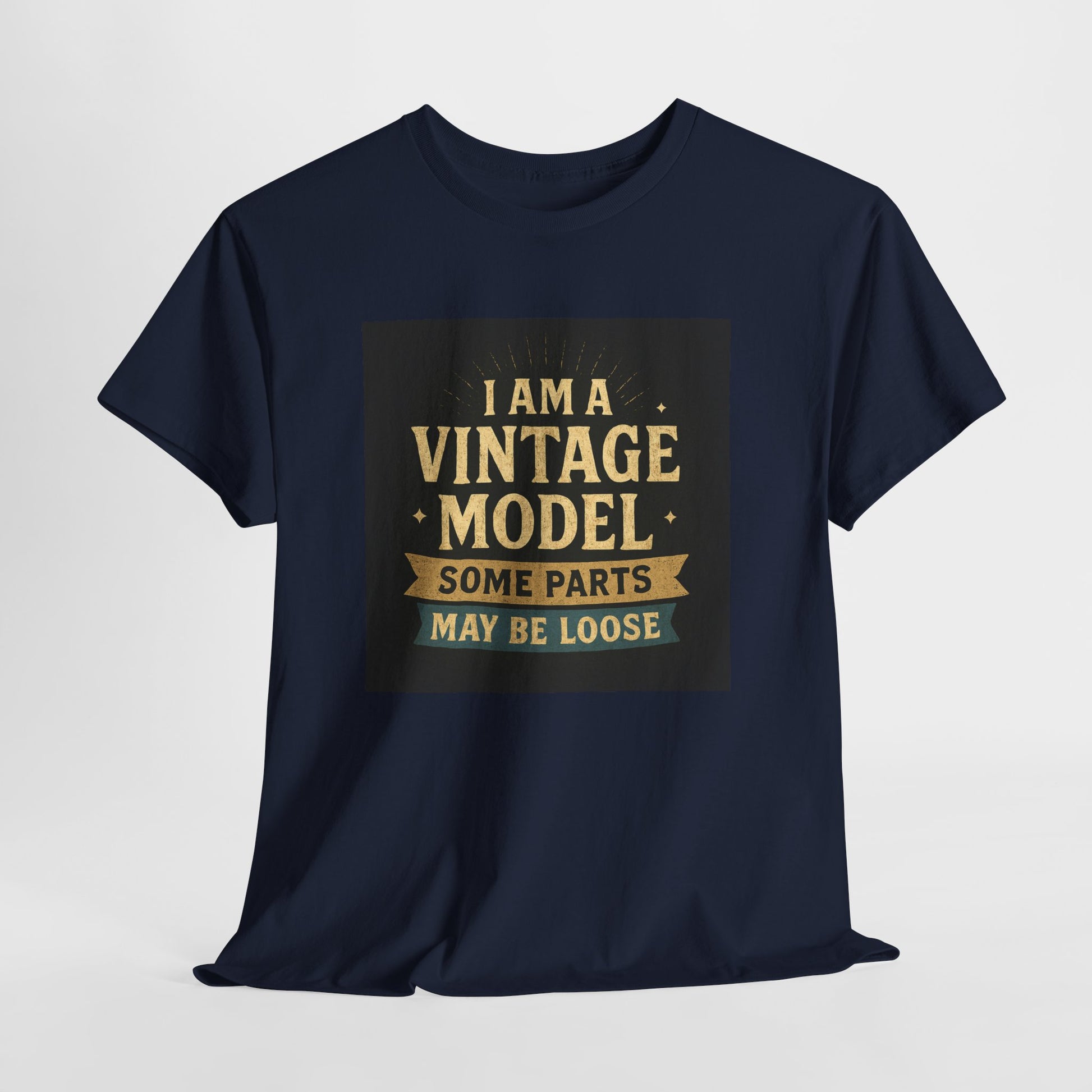 This relaxed cotton tee wears like a wink from another era — warm, slightly cheeky, and impossible to ignore. Centered on the chest is a distressed, retro-style badge reading “I AM A VINTAGE MODEL — SOME PARTS MAY BE LOOSE,” rendered in faded gold and cream on a charcoal block. The look reads like a well-loved find from a flea market: nostalgic type, subtle aging, and playful self-deprecation. Lightweight but sturdy, the shirt settles comfortably across the shoulders and drapes with a classic fit that works for everyday wear. Wear it to backyard barbecues, casual coffee dates, or family gatherings to spark a laugh and start easy conversation. It’s a piece that fits into a relaxed, humorous wardrobe — equal parts vintage attitude and modern comfort.