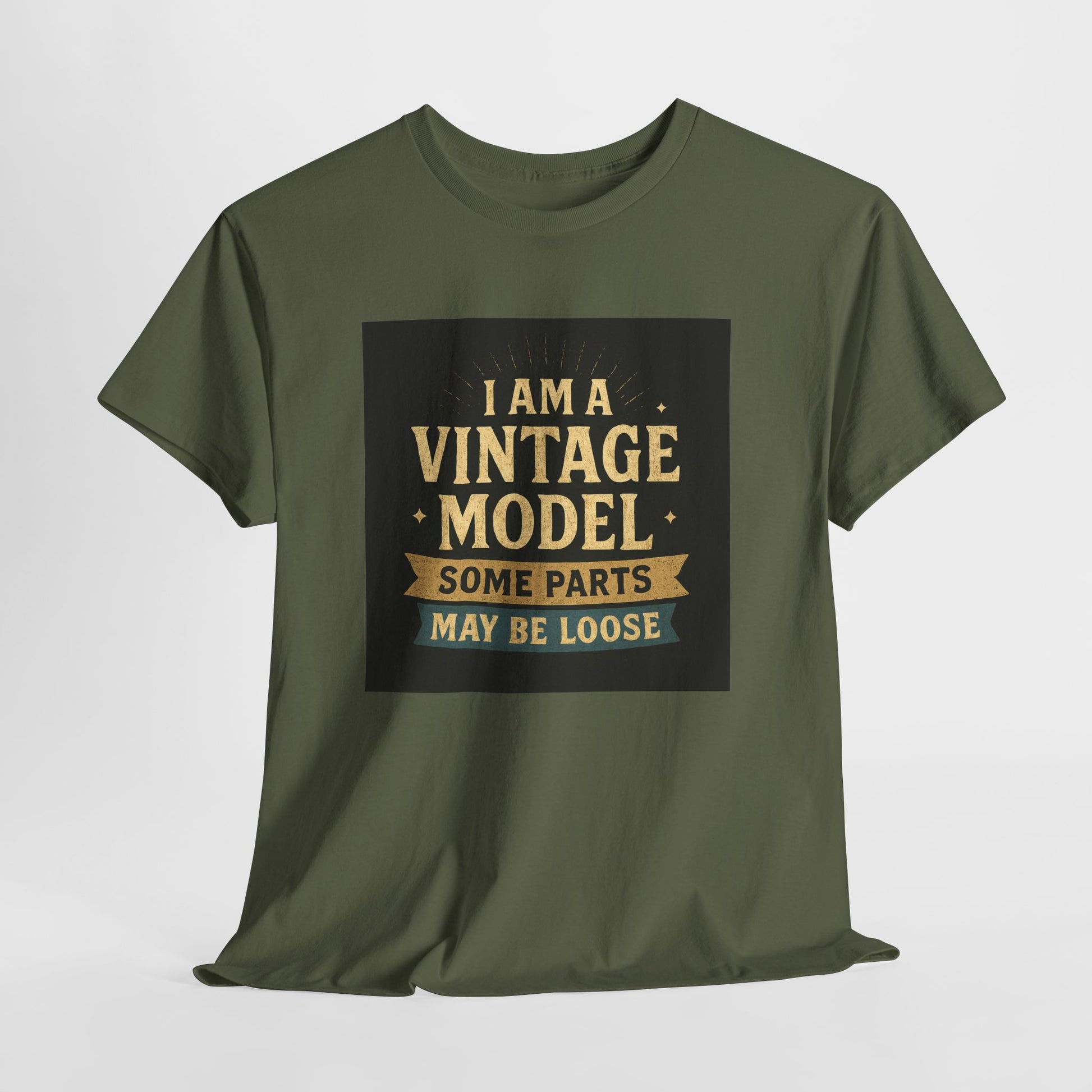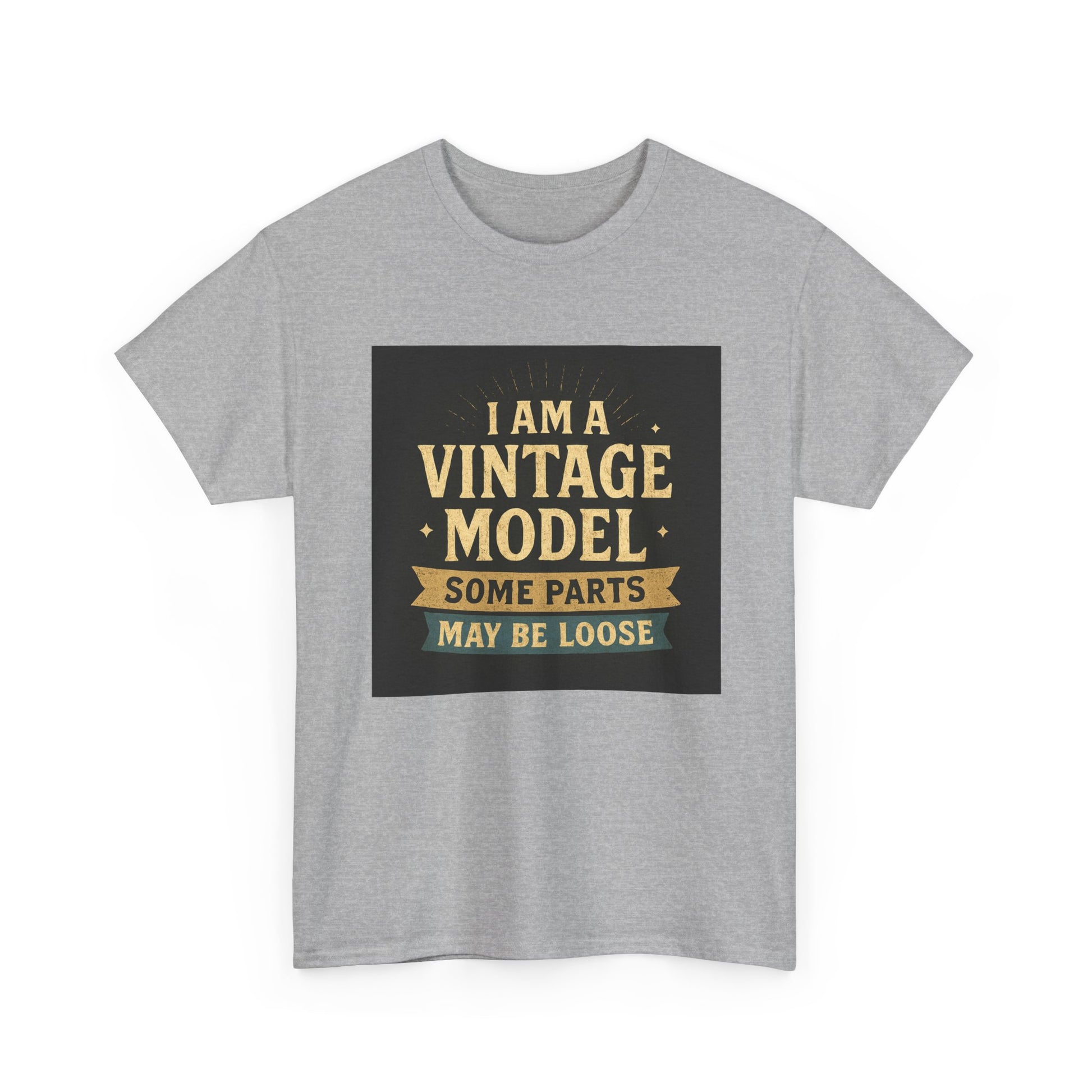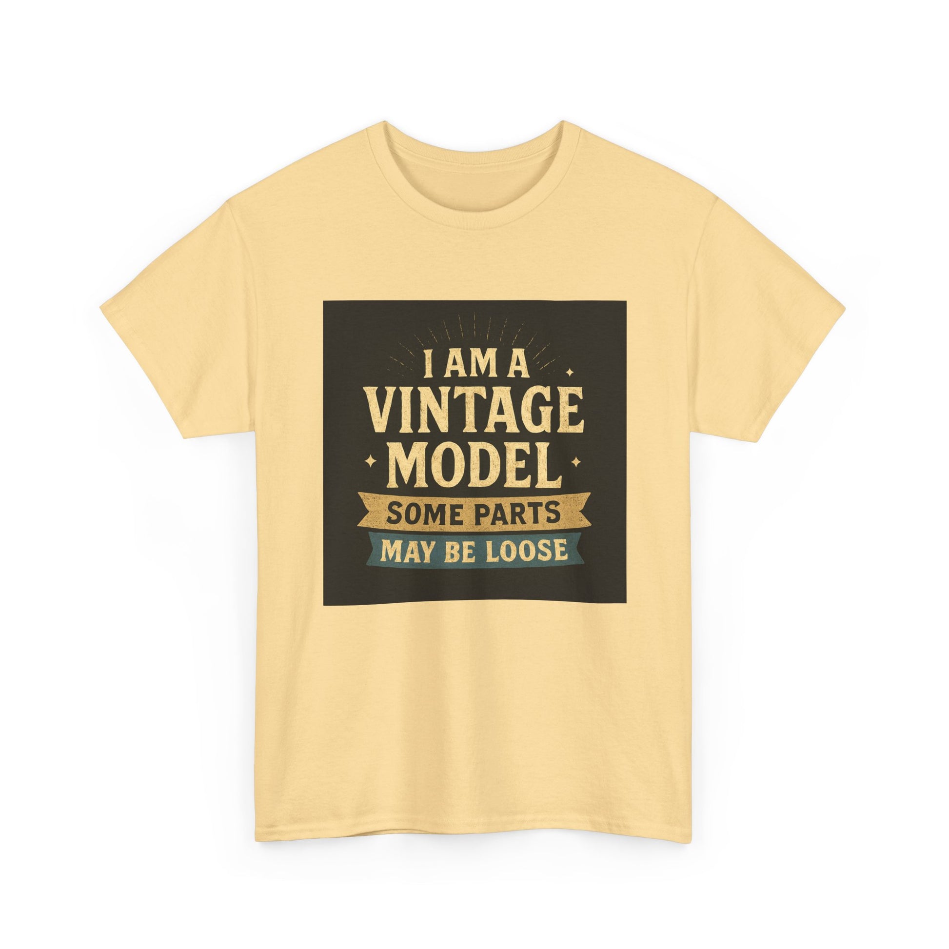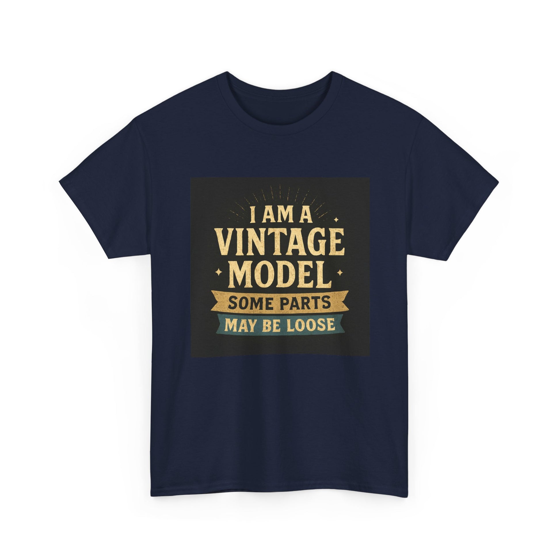 This relaxed cotton tee wears like a wink from another era — warm, slightly cheeky, and impossible to ignore. Centered on the chest is a distressed, retro-style badge reading “I AM A VINTAGE MODEL — SOME PARTS MAY BE LOOSE,” rendered in faded gold and cream on a charcoal block. The look reads like a well-loved find from a flea market: nostalgic type, subtle aging, and playful self-deprecation. Lightweight but sturdy, the shirt settles comfortably across the shoulders and drapes with a classic fit that works for everyday wear. Wear it to backyard barbecues, casual coffee dates, or family gatherings to spark a laugh and start easy conversation. It’s a piece that fits into a relaxed, humorous wardrobe — equal parts vintage attitude and modern comfort.