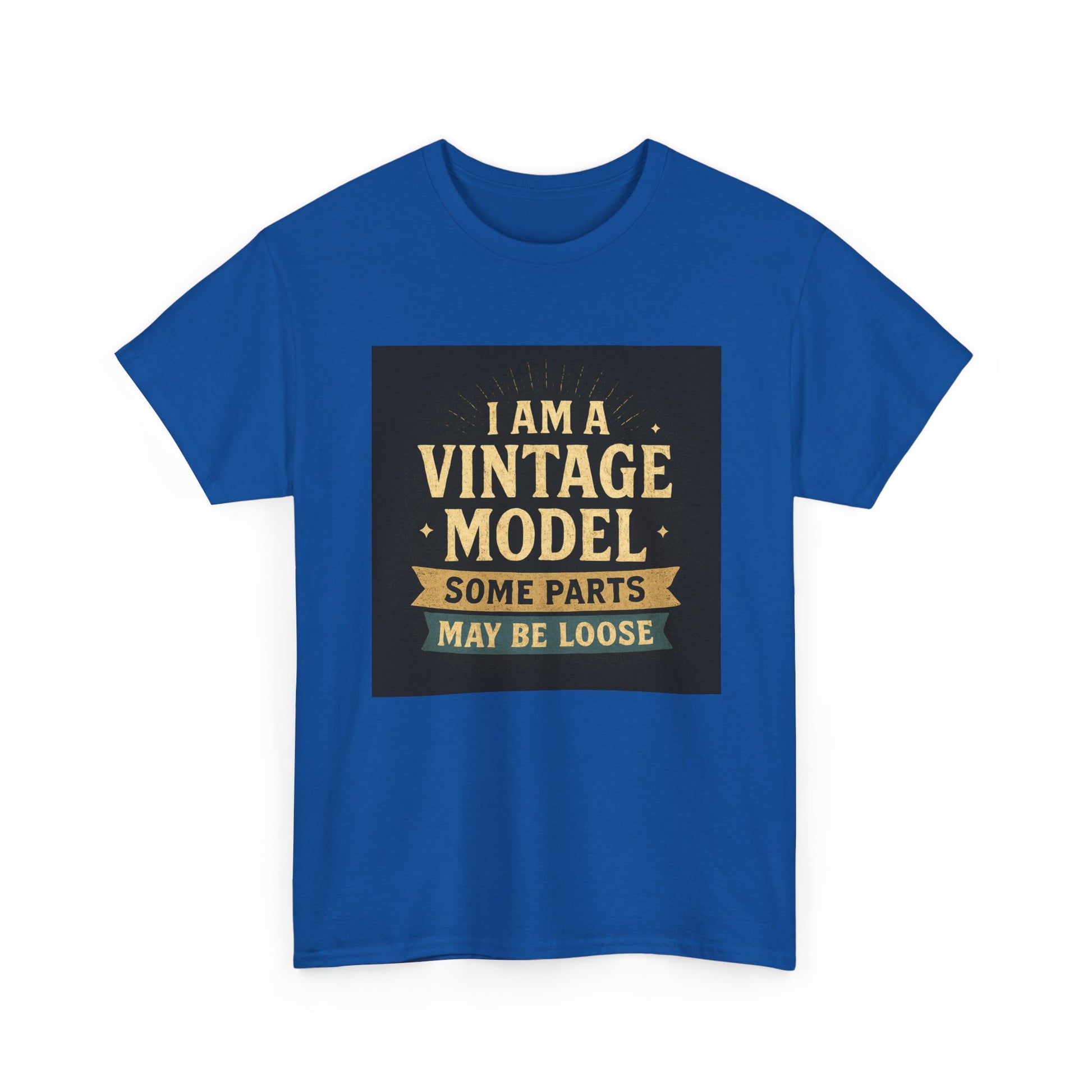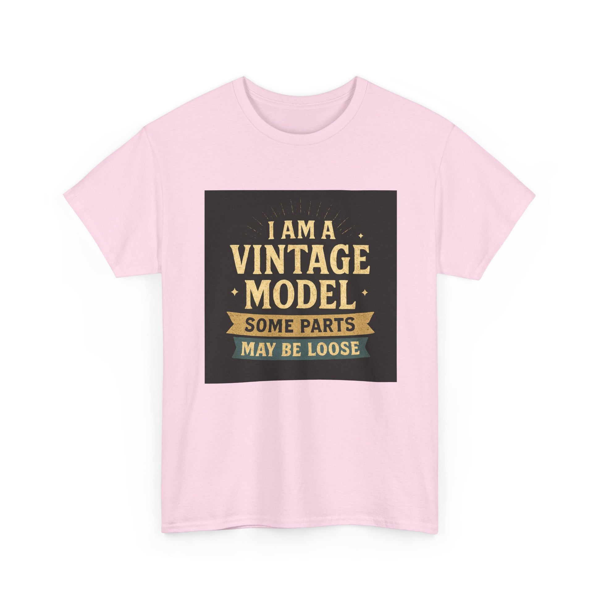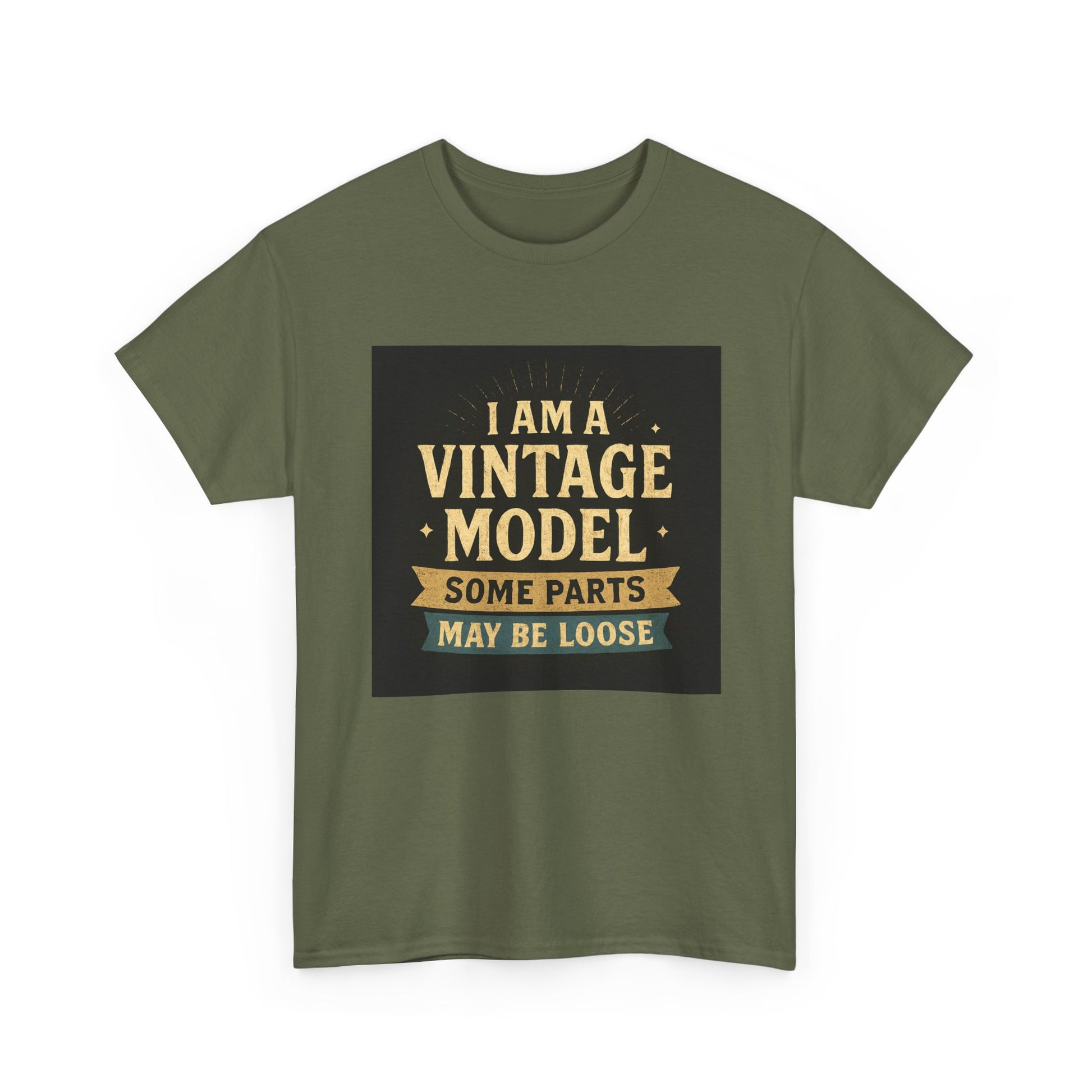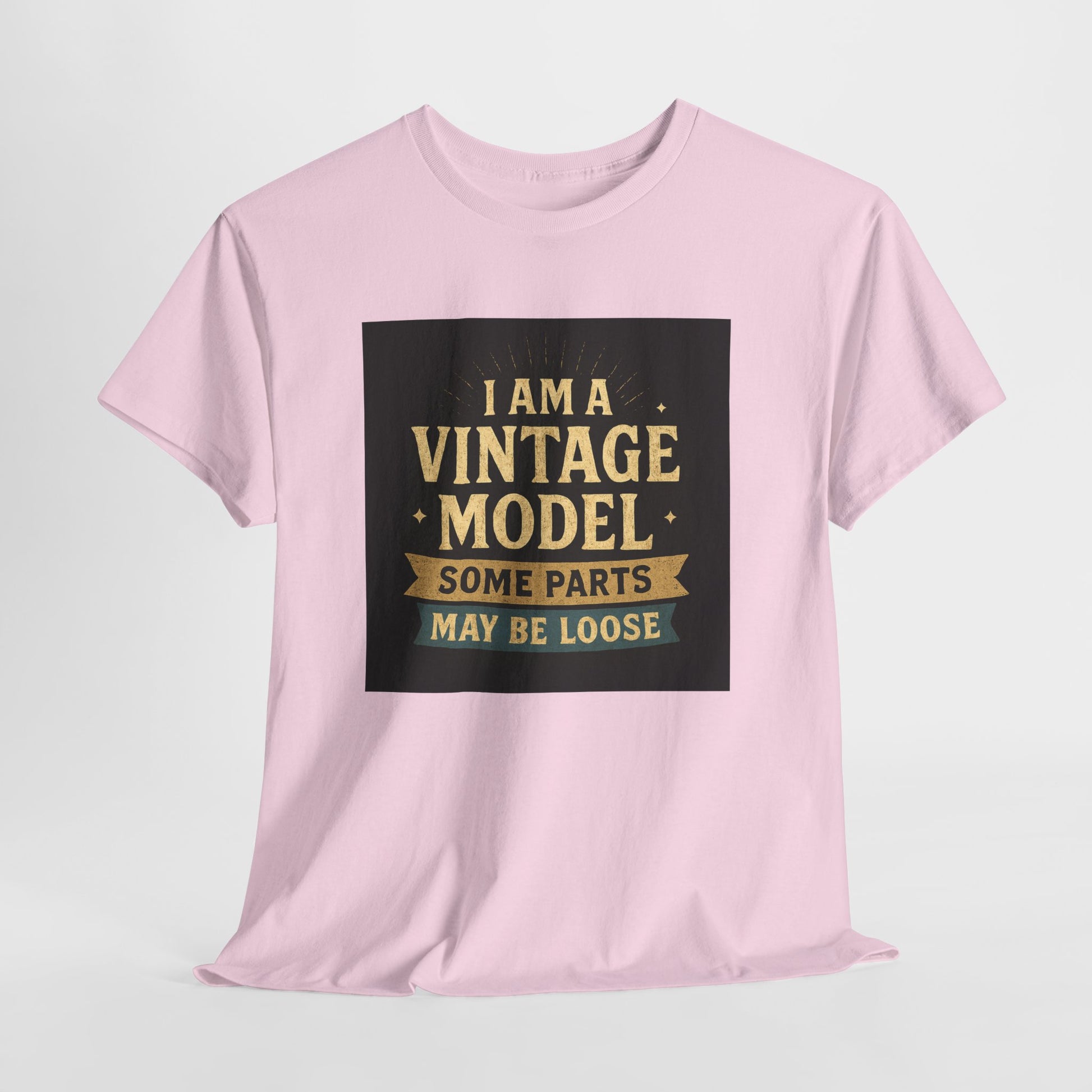 This relaxed cotton tee wears like a wink from another era — warm, slightly cheeky, and impossible to ignore. Centered on the chest is a distressed, retro-style badge reading “I AM A VINTAGE MODEL — SOME PARTS MAY BE LOOSE,” rendered in faded gold and cream on a charcoal block. The look reads like a well-loved find from a flea market: nostalgic type, subtle aging, and playful self-deprecation. Lightweight but sturdy, the shirt settles comfortably across the shoulders and drapes with a classic fit that works for everyday wear. Wear it to backyard barbecues, casual coffee dates, or family gatherings to spark a laugh and start easy conversation. It’s a piece that fits into a relaxed, humorous wardrobe — equal parts vintage attitude and modern comfort.